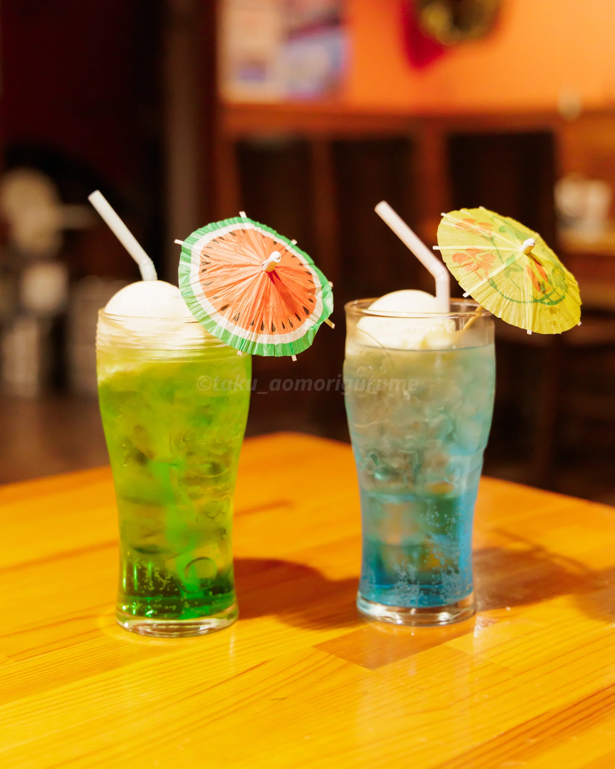 フロート各種の中から、今回はメロンフロートとブルーハワイフロートを注文。