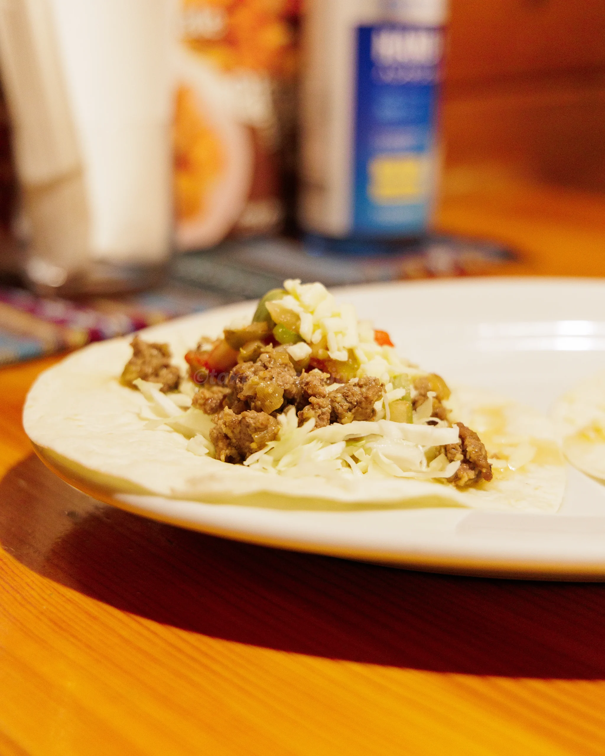 甘辛くスパイシーな味付けのポークのタコミートに、キャベツ、ピクルス、そしてチーズ。