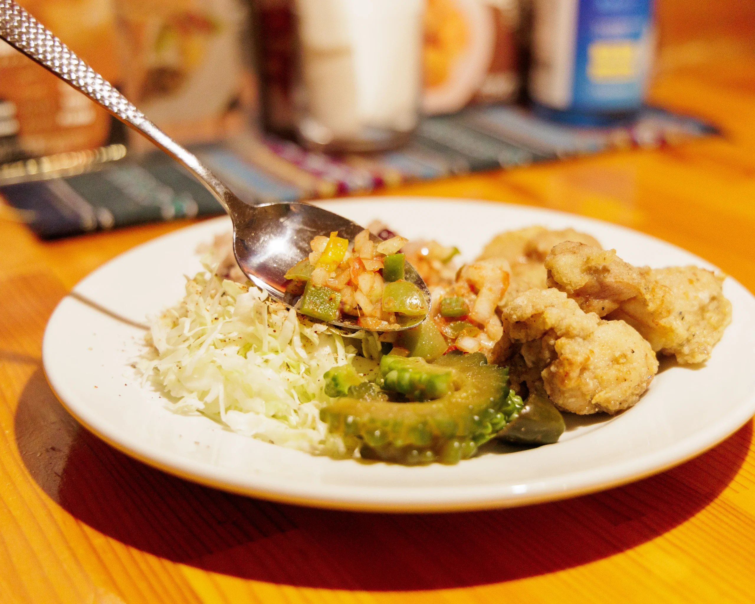 マイルドな酸味とほのかな辛味、シャキシャキとしたフレッシュな食感があり、塩気がちょうど良いジャークチキンと口内調理されると、そこはまさにエスニック。