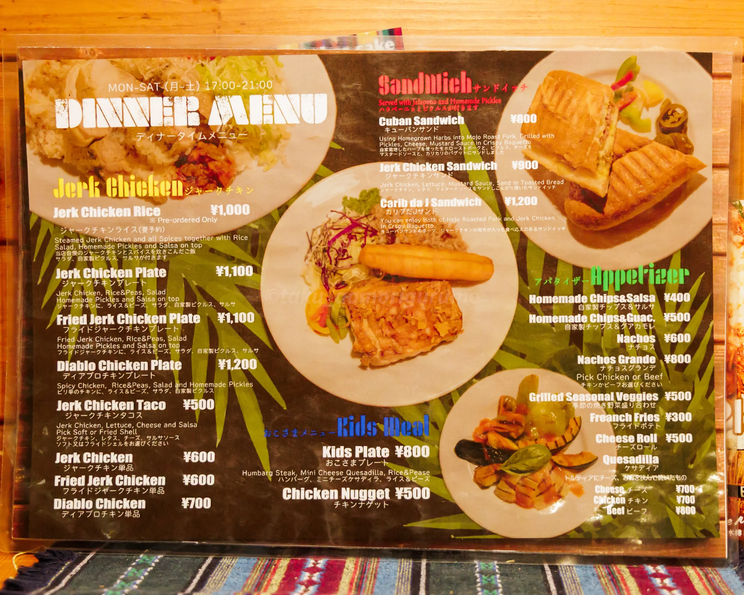 ジャークチキンをメインにしたメニューや、キューバンサンドなどのサンドイッチ、アパタイザー(前菜、軽食という意味)、タコス、アラカルト、デザートなどが注文可能。