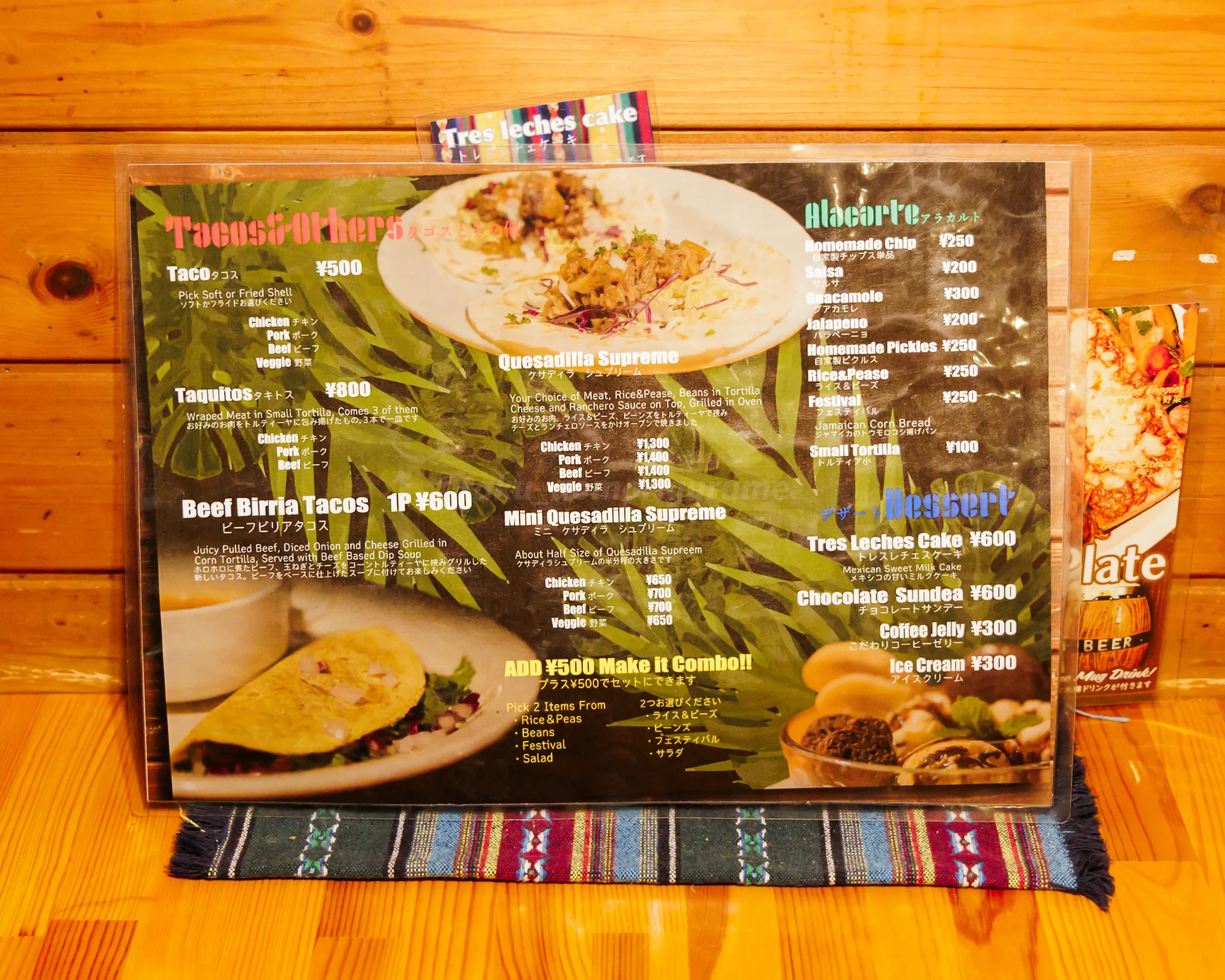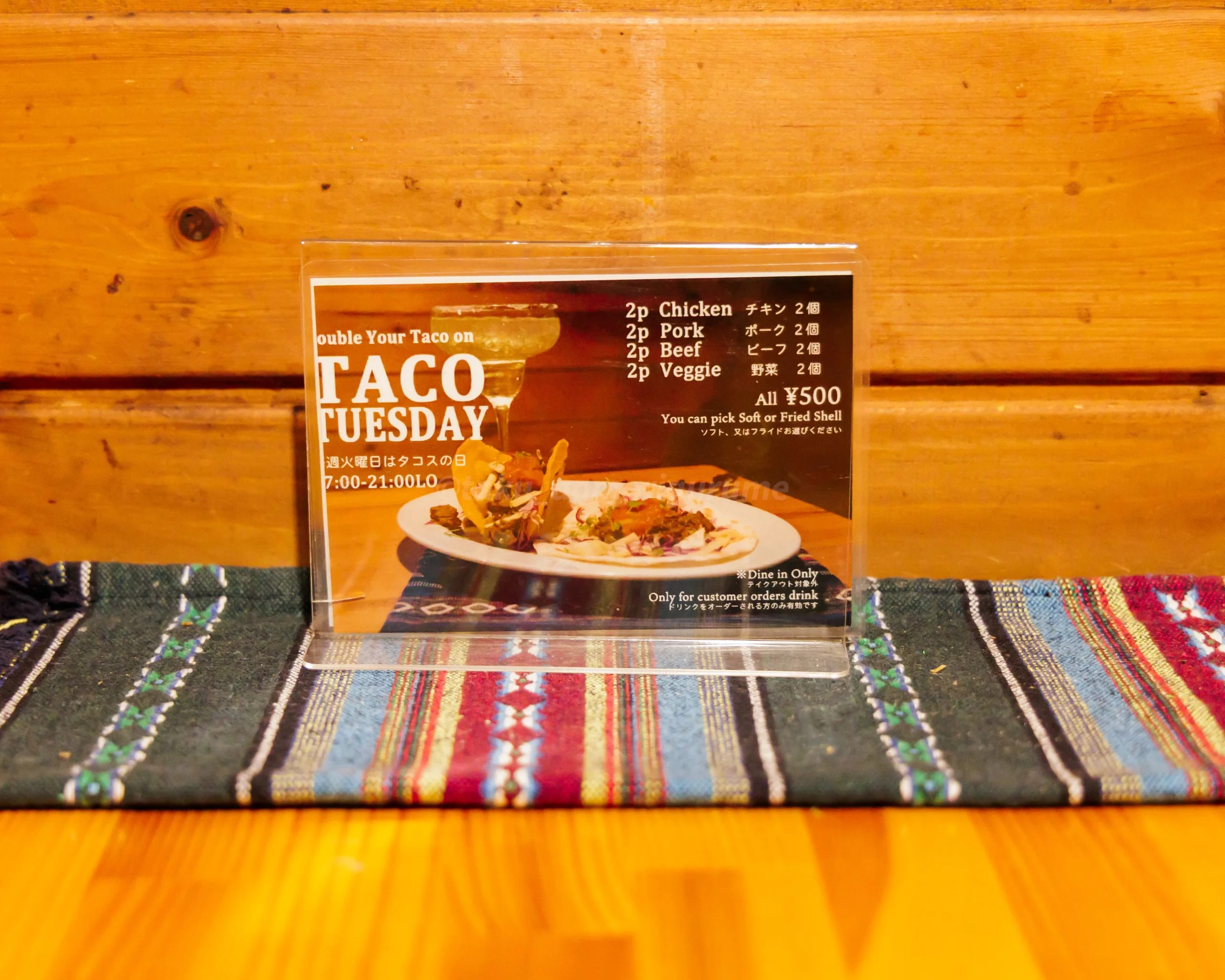 毎週火曜日の夜営業は、タコス各種(2P)がワンコインで楽しめる、タコチューズデーを開催しているとの事。
