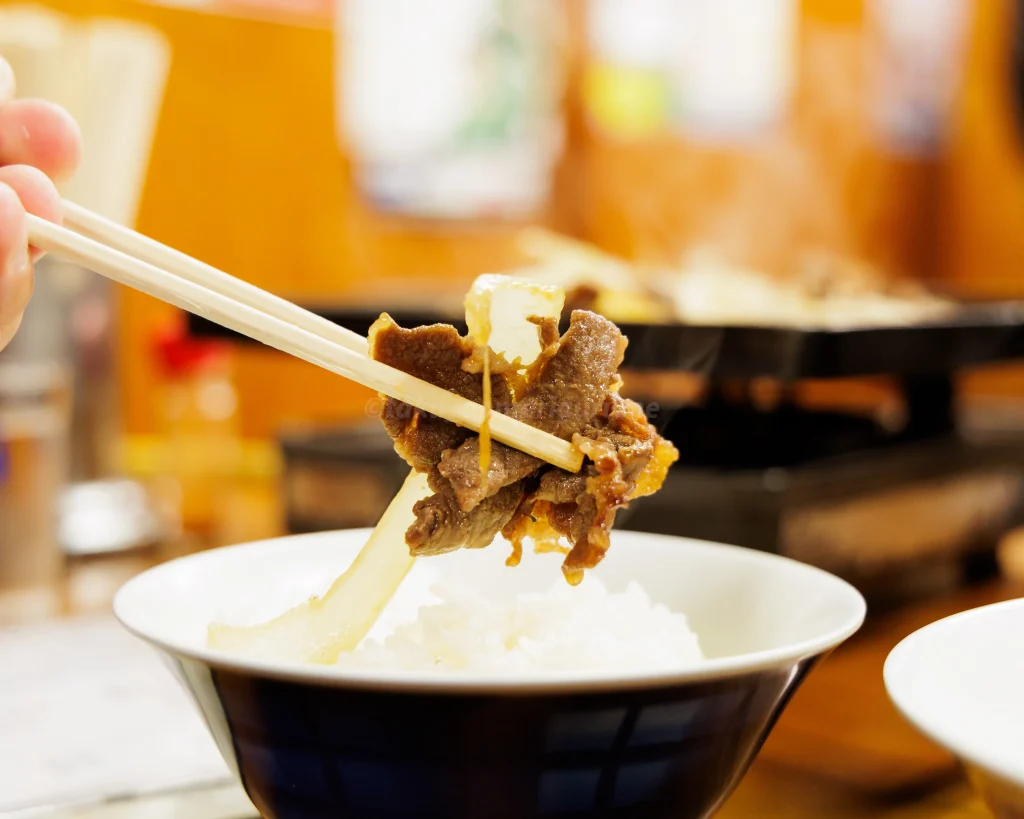 甘辛いかけダレの味わいが、メイラード反応で茶色くなり始めた玉ねぎのシャキシャキとした食感と、牛バラ肉の脂肪分と赤味の異なる旨味と口内調理されることにより、間違いない美味しさが広がっていった。