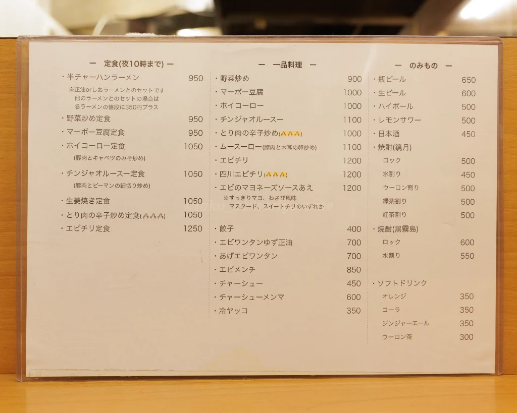 中華料理の定食は、夜10時までしかやっていないので、それ狙いの方は要注意。