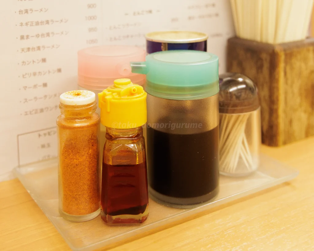 手前左側から、一味唐辛子、ラー油、醤油、爪楊枝。