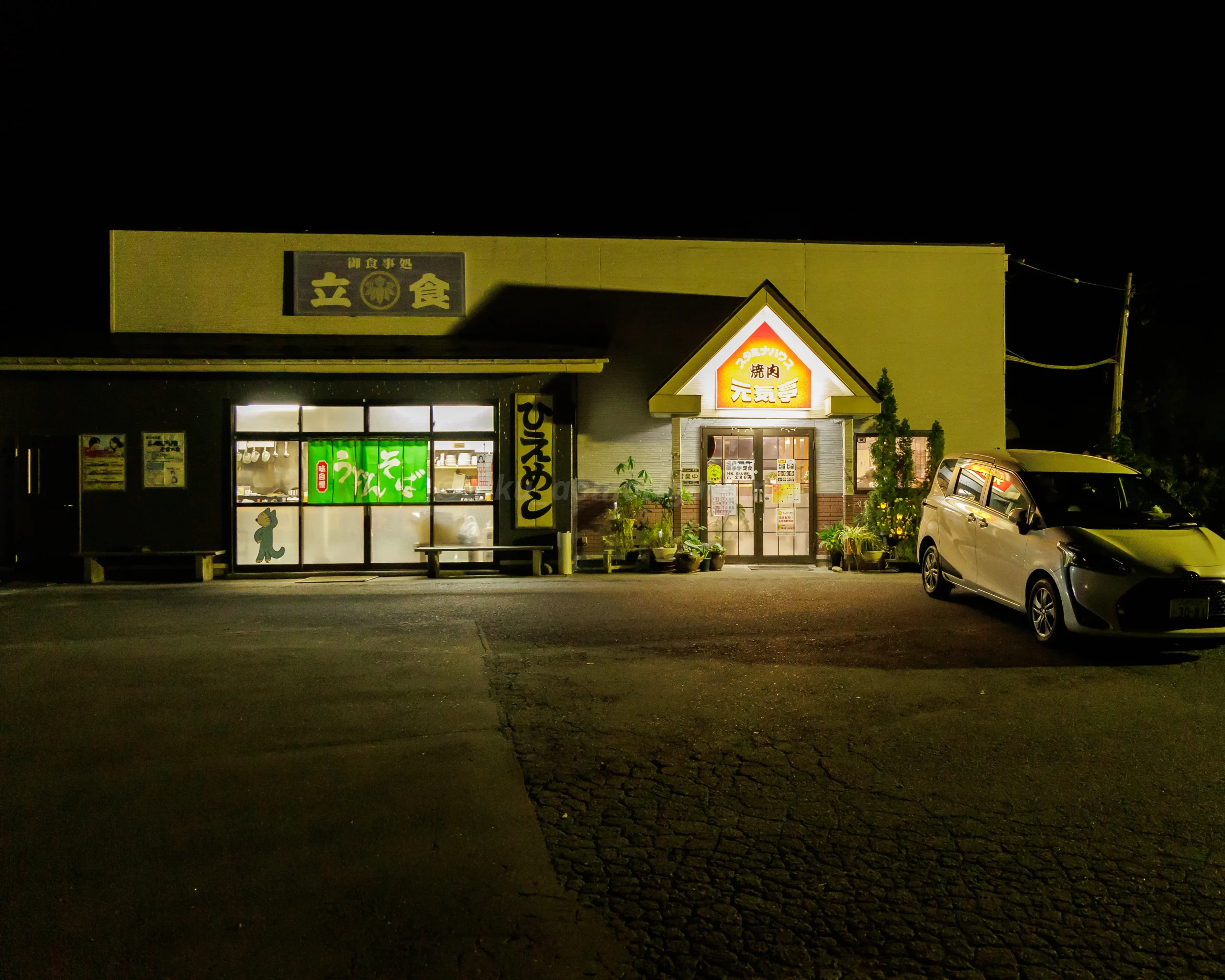 店舗は、焼肉店の「スタミナハウス 焼肉 元気亭」と、カウンター席のみのお食事処「立食(たちしょく)」が同じ建物内に併設されています。出入口は別ですが、店内に壁はなく通り抜けが可能で、トイレも共用となっていました。