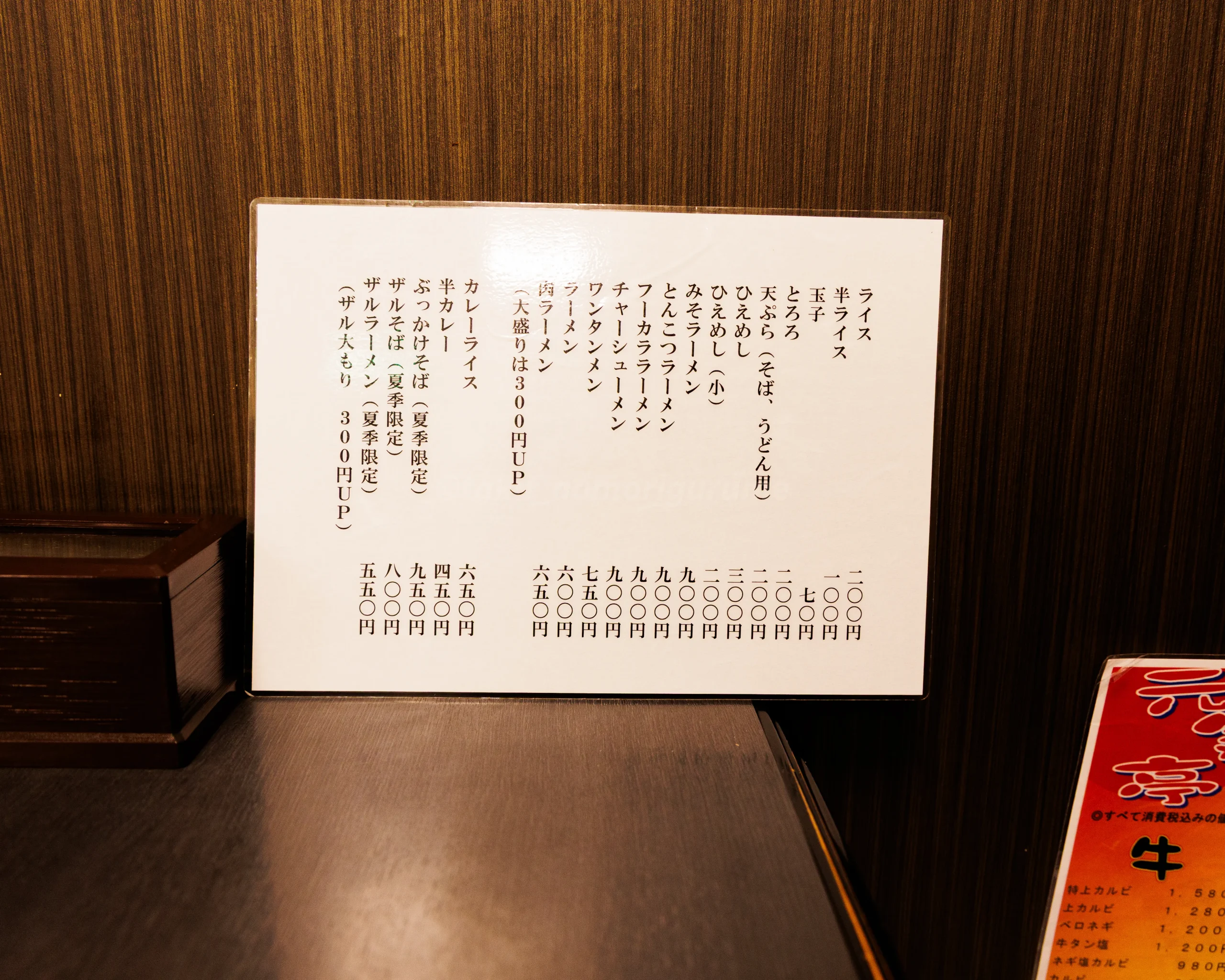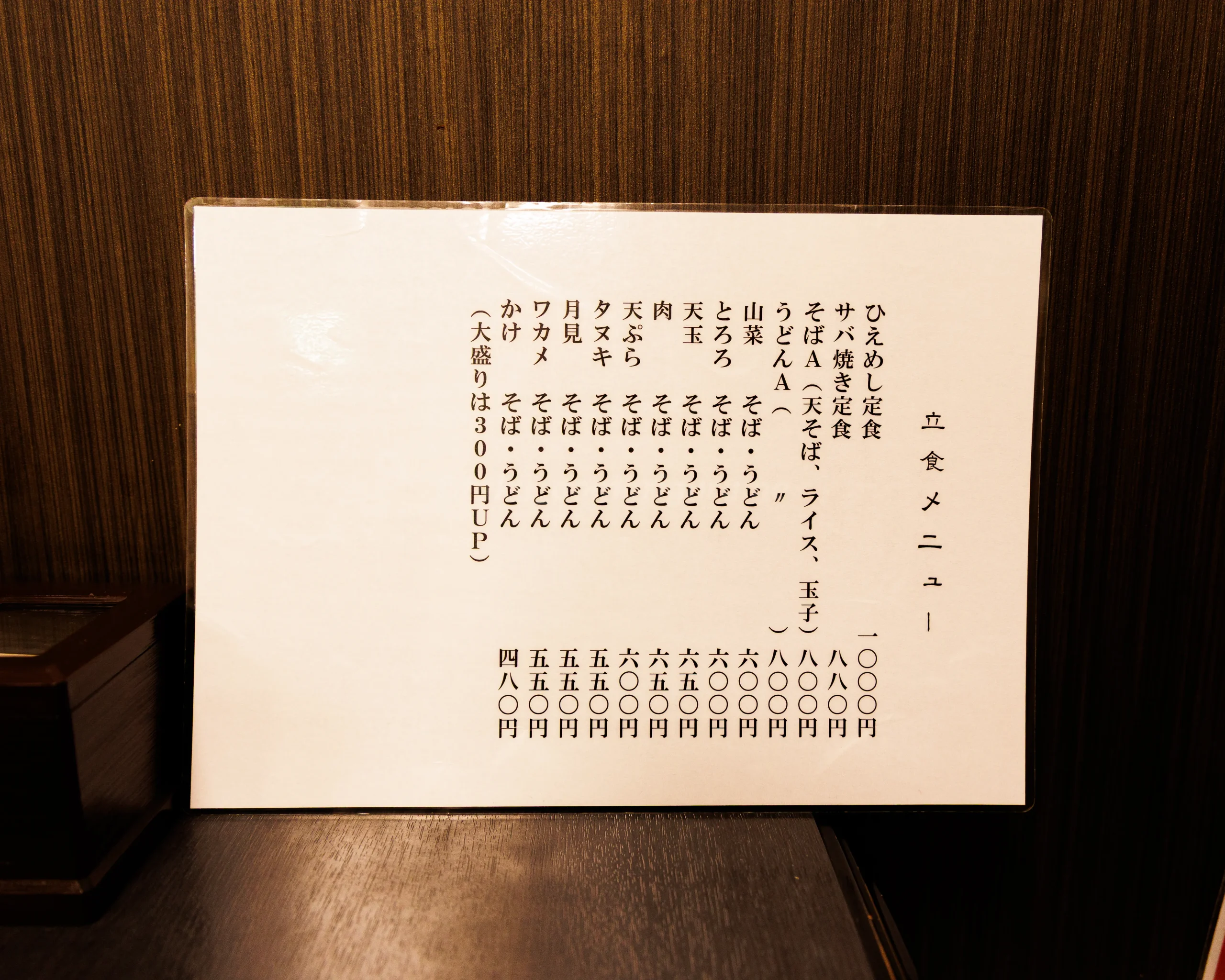 店内のメニュー(お食事処 立食(たちしょく))。