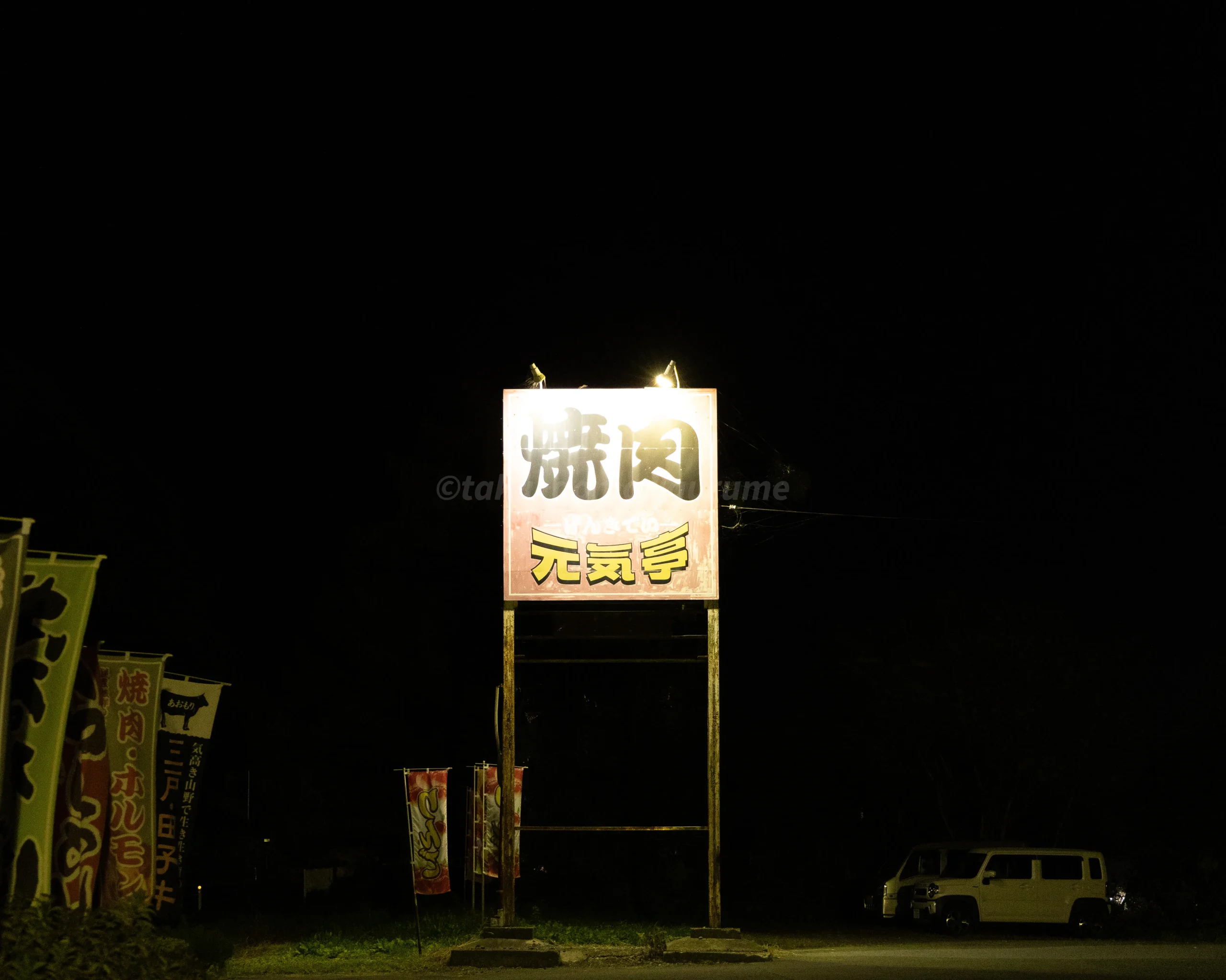 夜に訪問したため、赤を基調とした看板がよく目立っており、初めてでも分かりやすい印象でした。店舗敷地内には国道4号線沿いに看板も設置されています。
