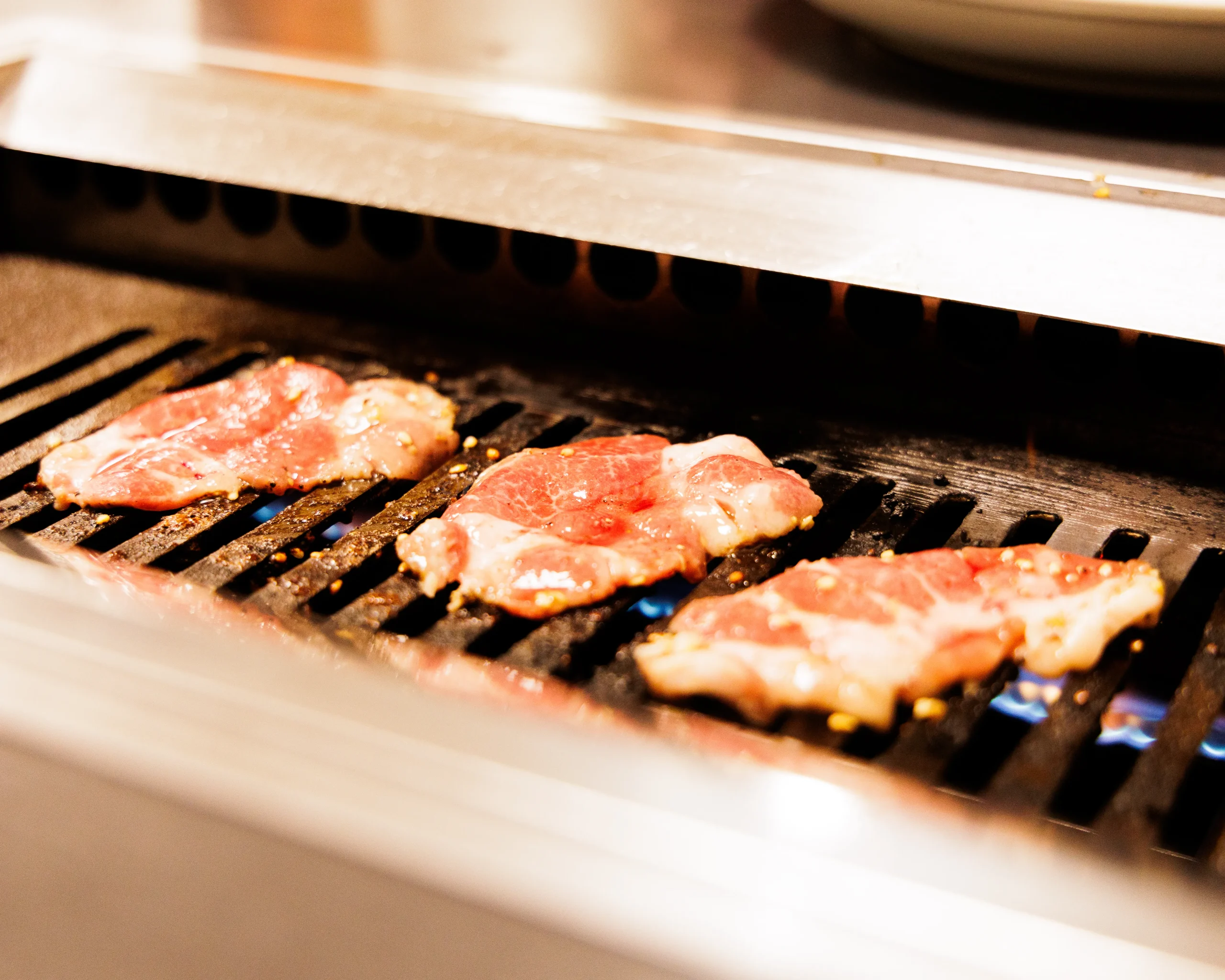 早速、元気亭焼肉定食用のアメリカ産牛を、ガス火の鉄板で焼いてみた。