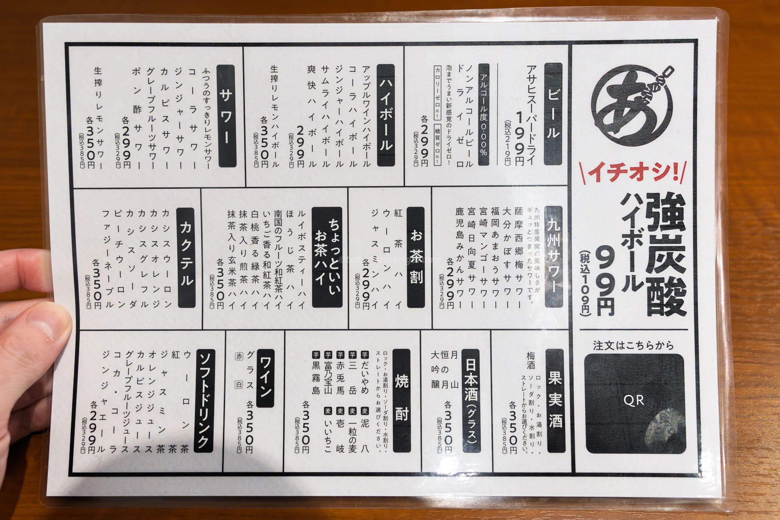 サワーやカクテル、さらには九州らしいお茶割りシリーズまで幅広く揃っており、「今日は安く、でもしっかり飲みたい」という日の心強い味方になってくれる構成。