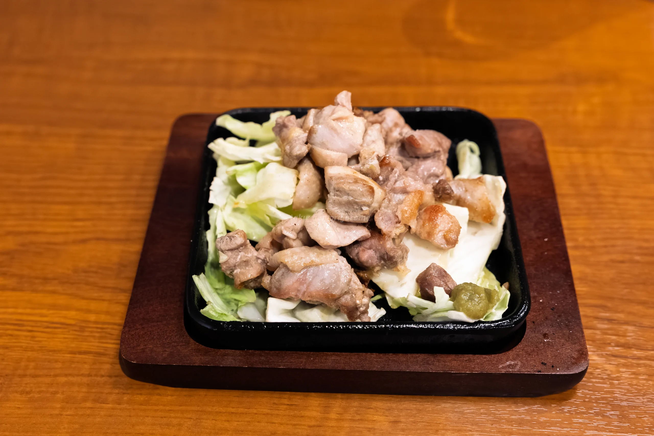 黒い鉄板の上にキャベツを敷き、その上に炭火(ゴロ焼き)で香ばしく焼かれた鶏肉がたっぷり。