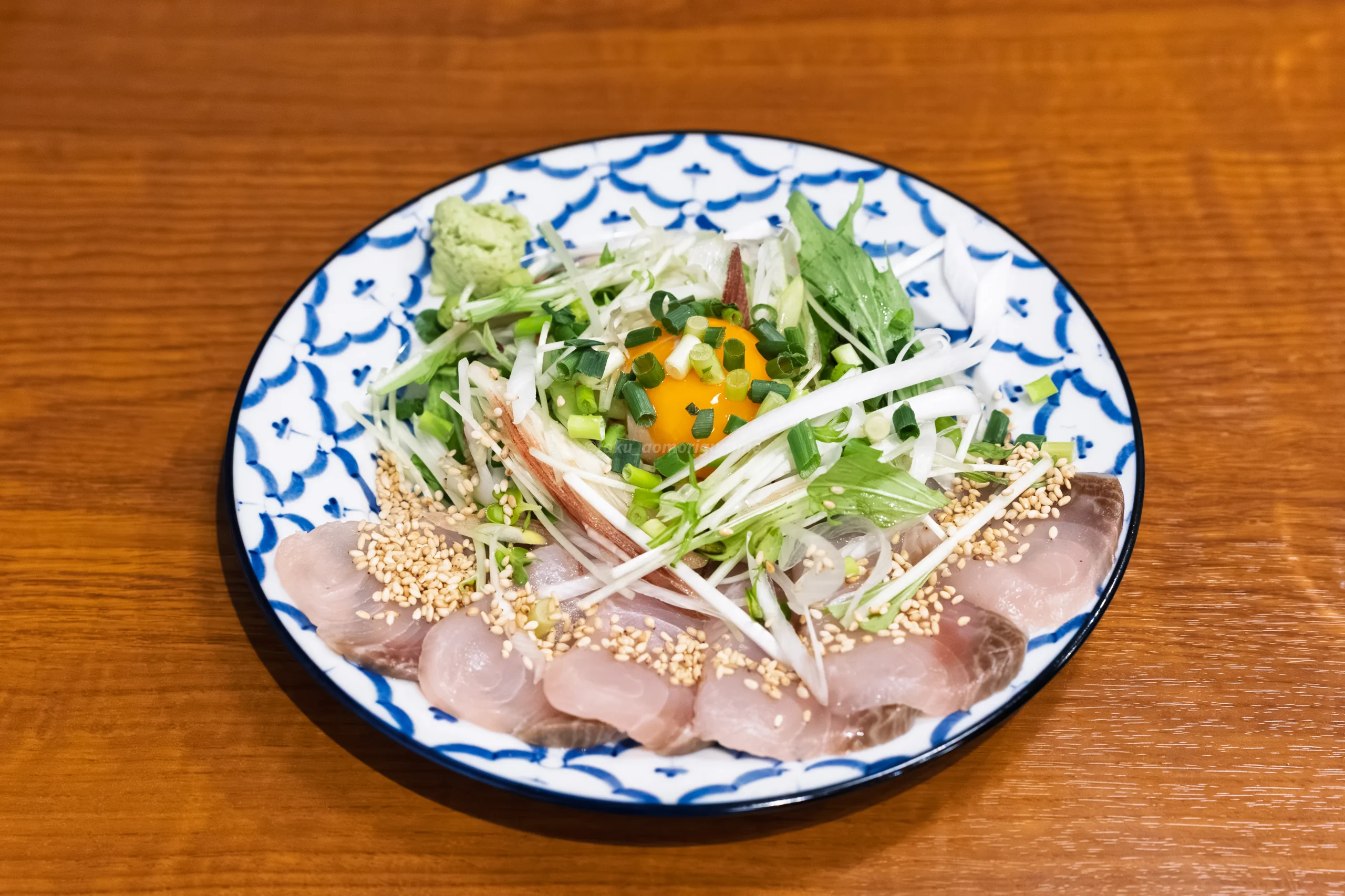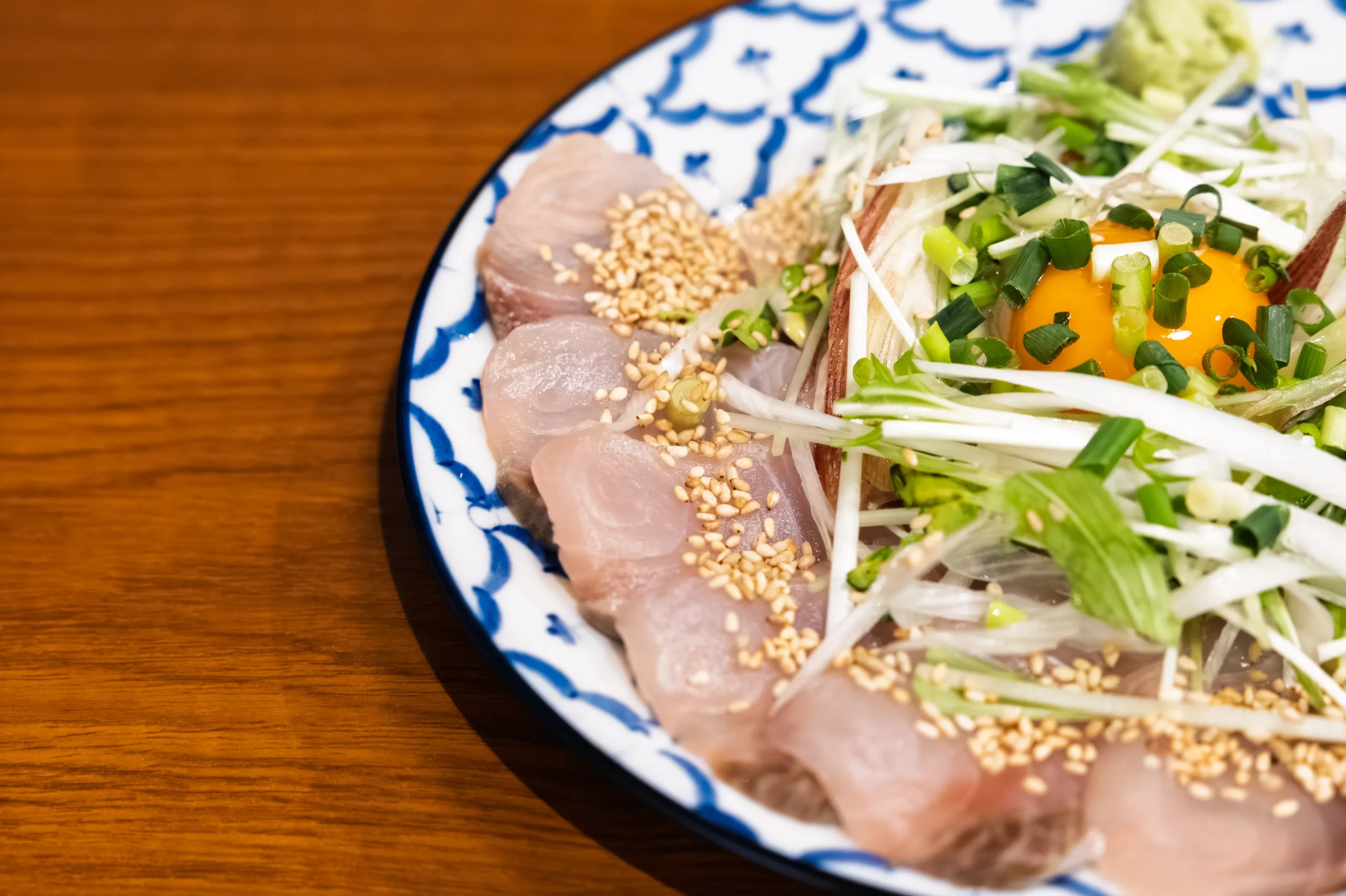 新鮮なかんぱちの切り身が並び、その上には卵黄、たっぷりのネギ、ミョウガ、白ごまがトッピングされていました。