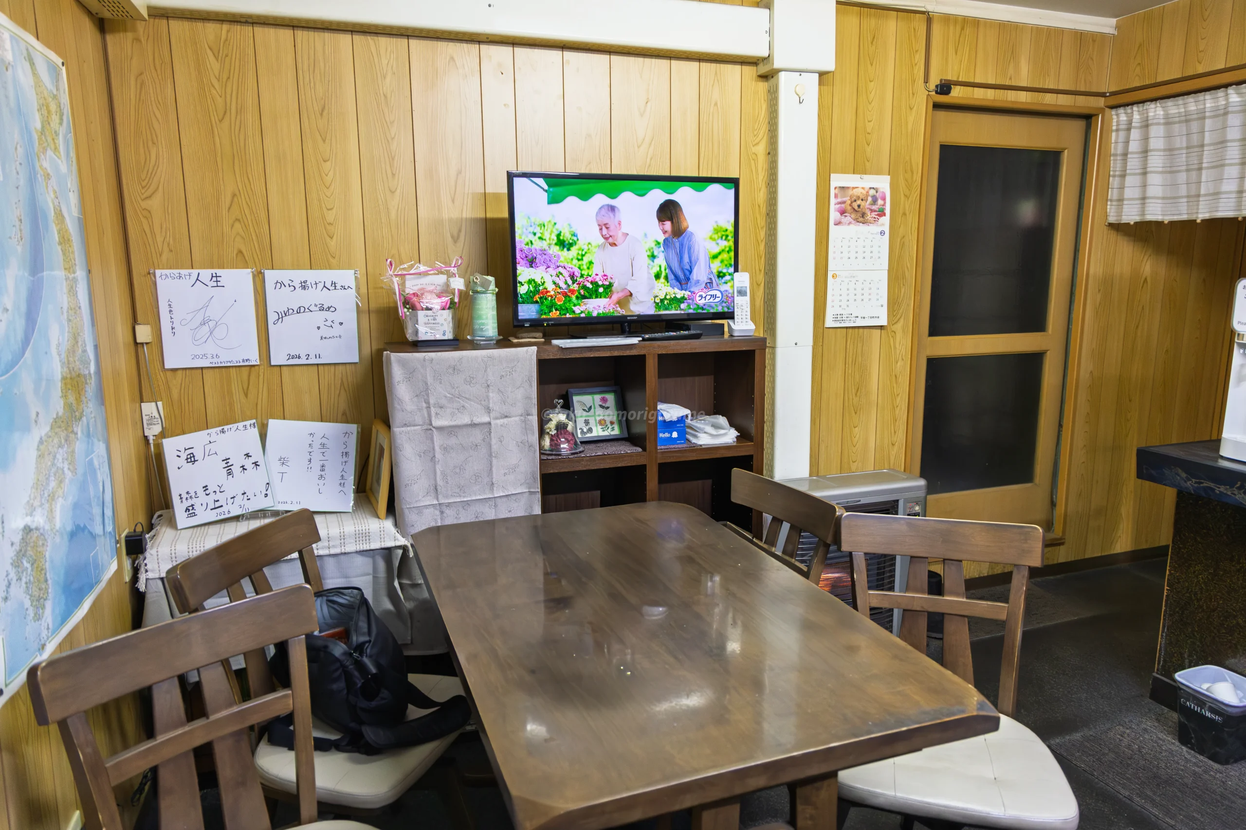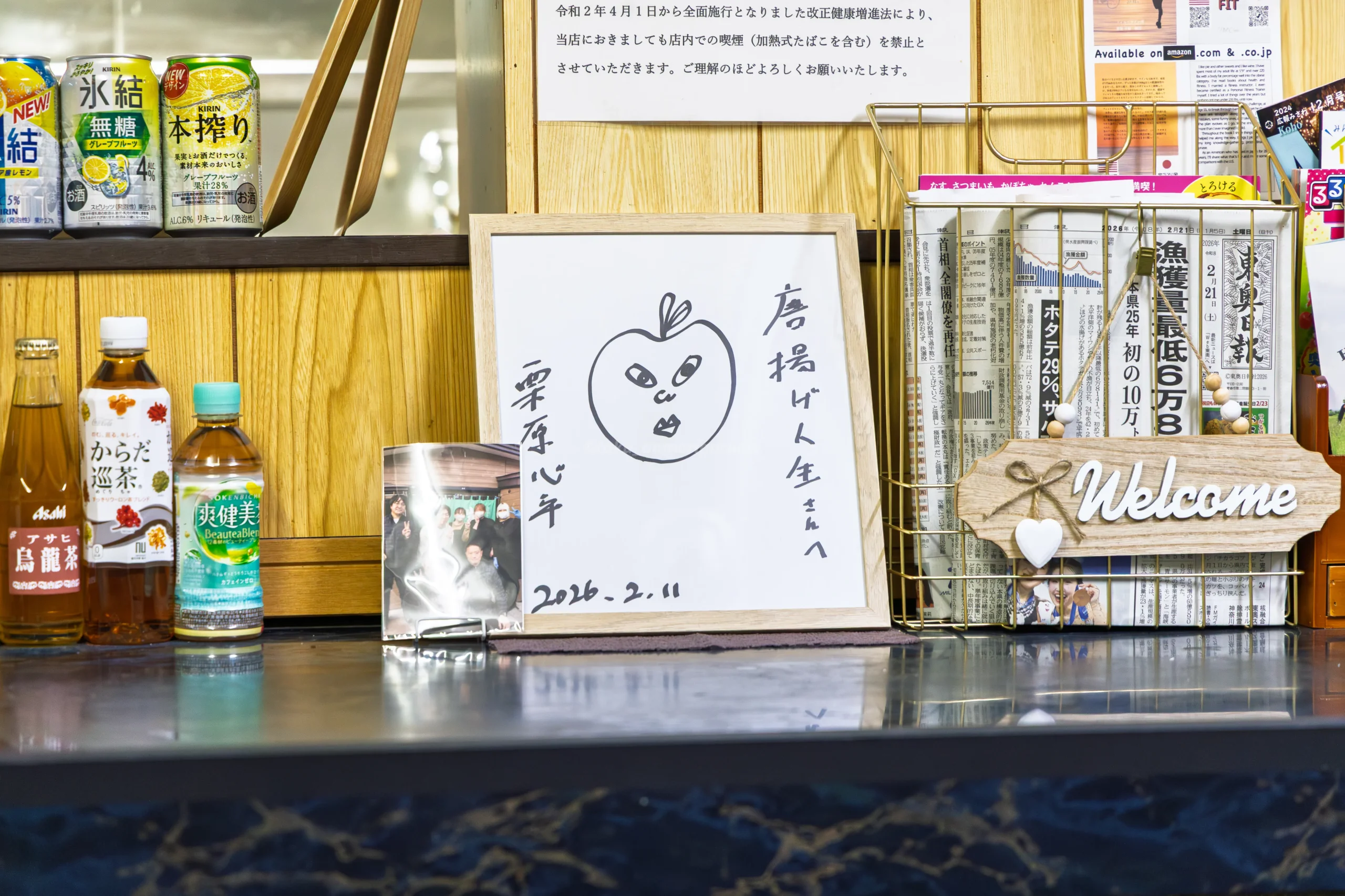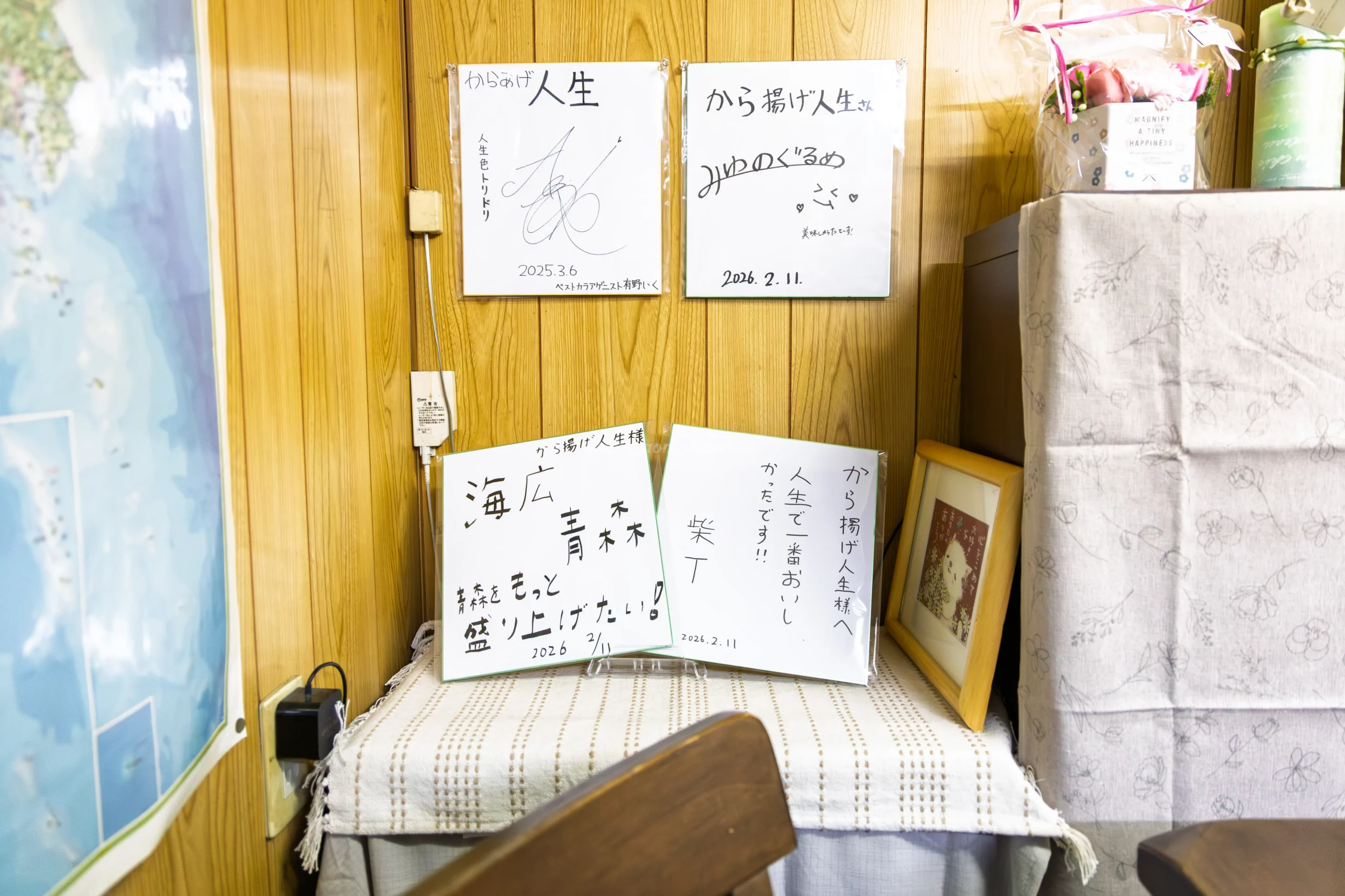 2026年2月11日に、料理家で青森県が大好きな栗原心平さんや、青森県の飲食店を取り上げるインフルエンサー数名、青森県職員らの記念写真や、色紙が飾られていました。