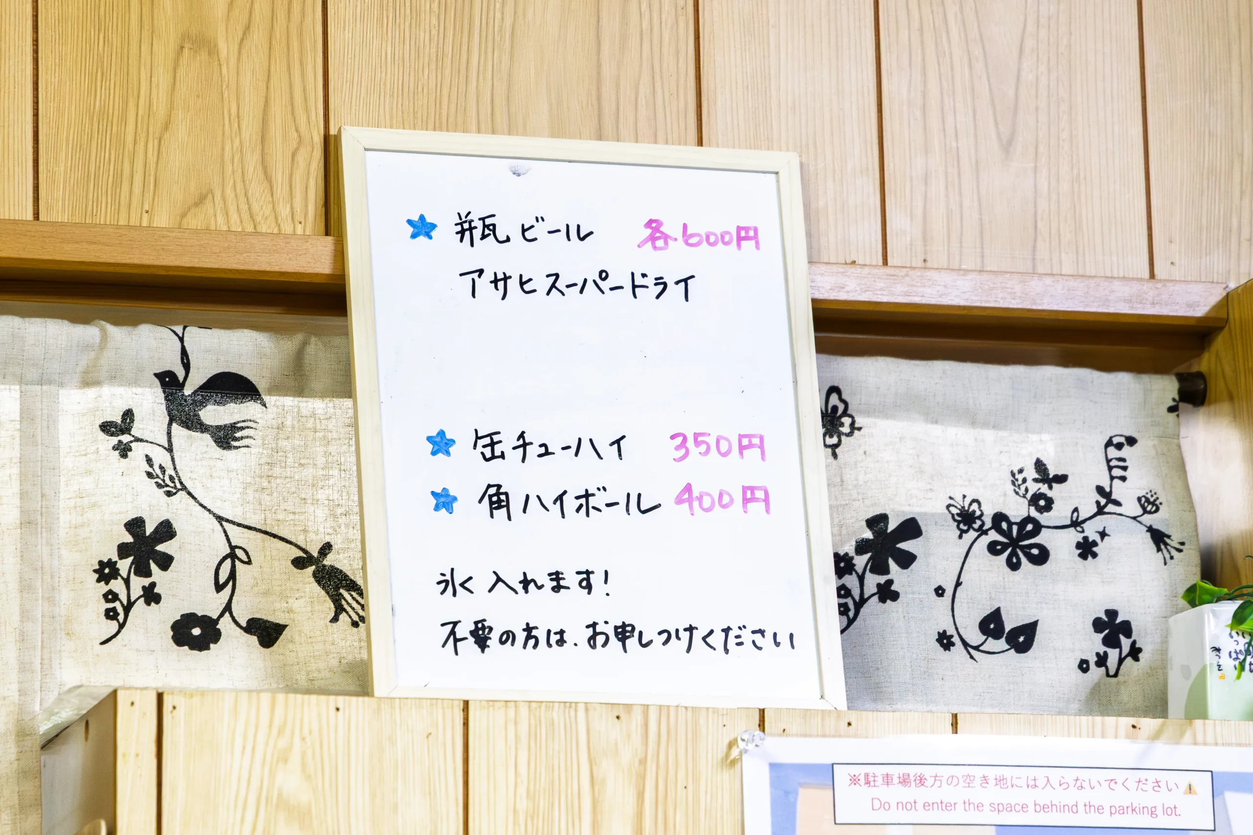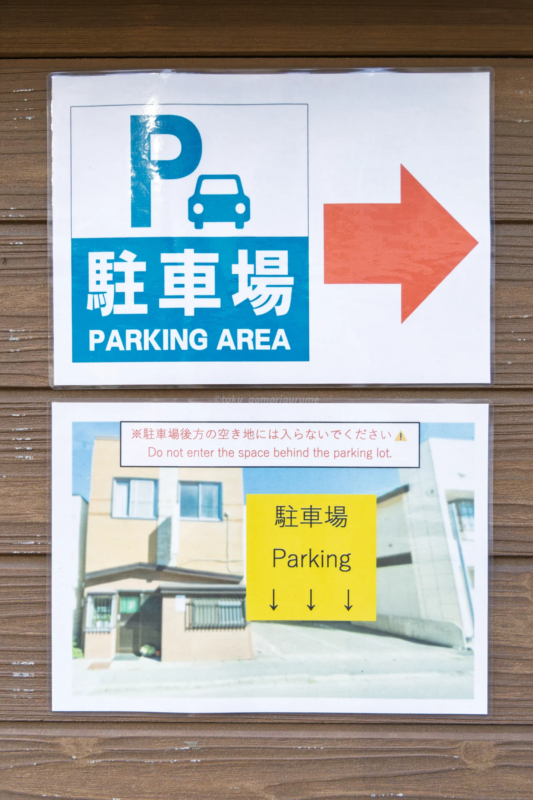 店舗正面出入口の右脇の壁に掲示されていた駐車場案内。