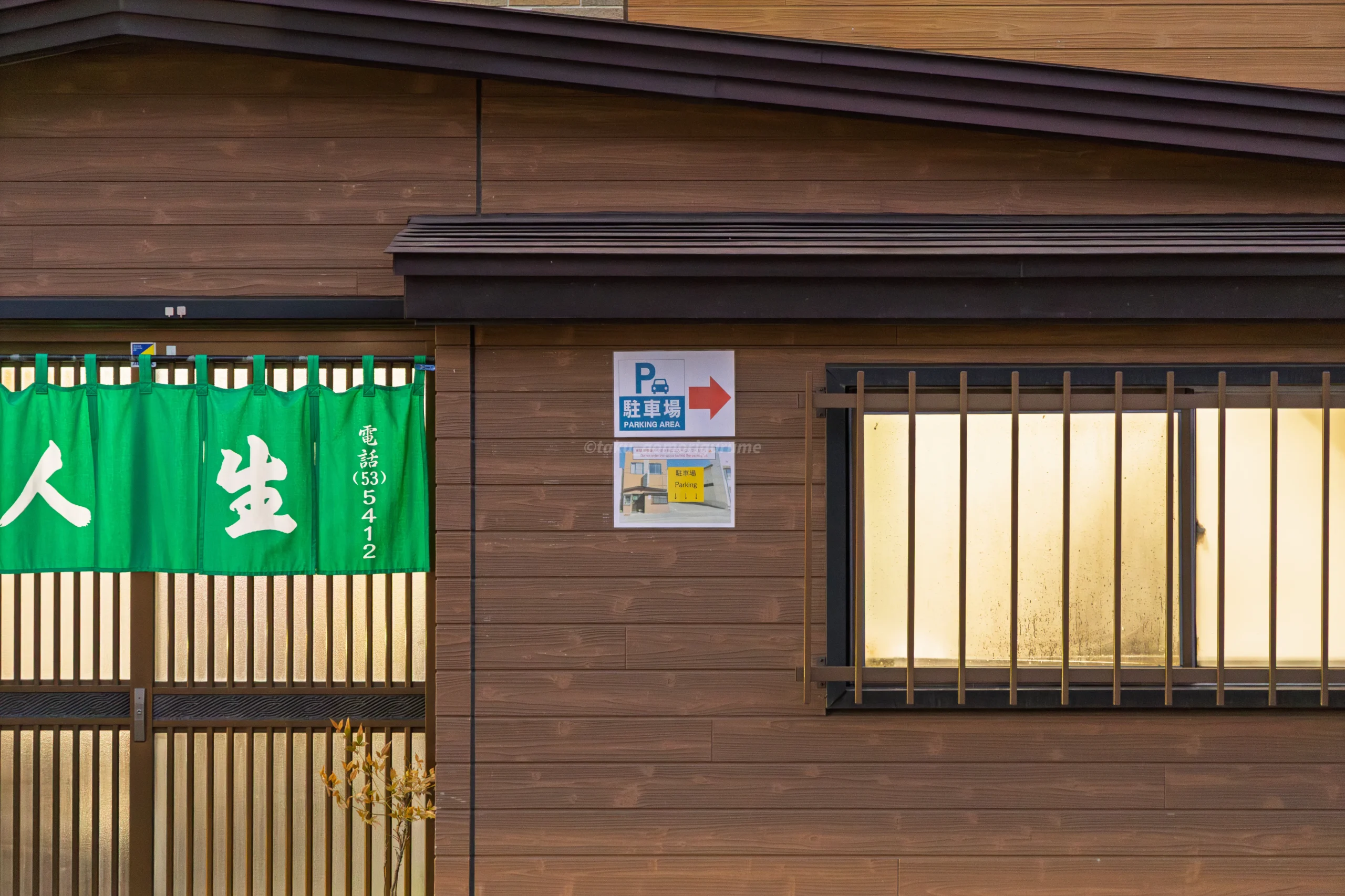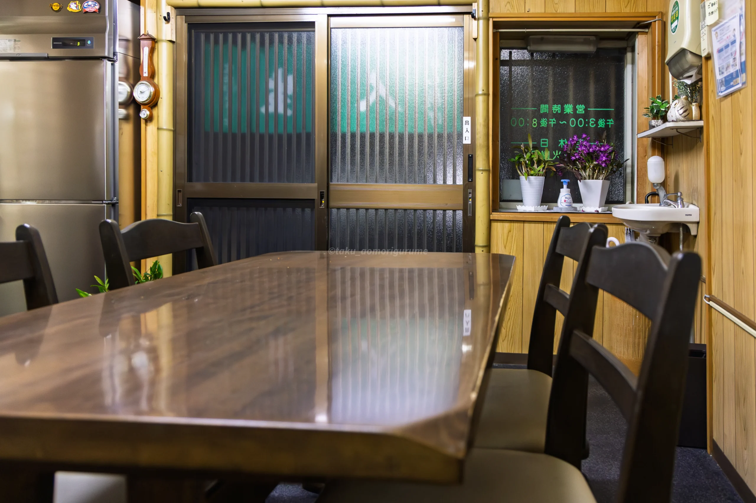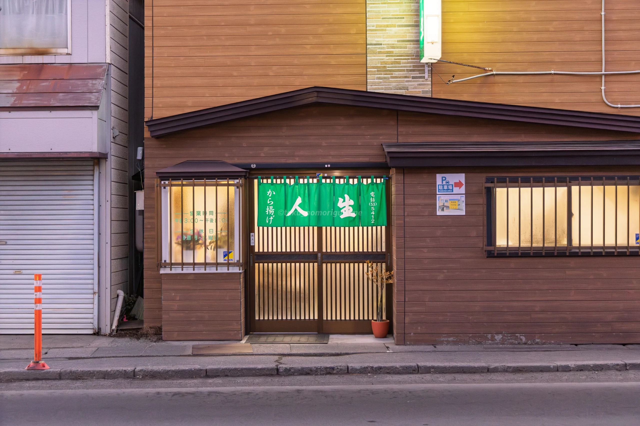 のれんの左のガラスには、緑の文字で営業時間と定休日が記載されていた。