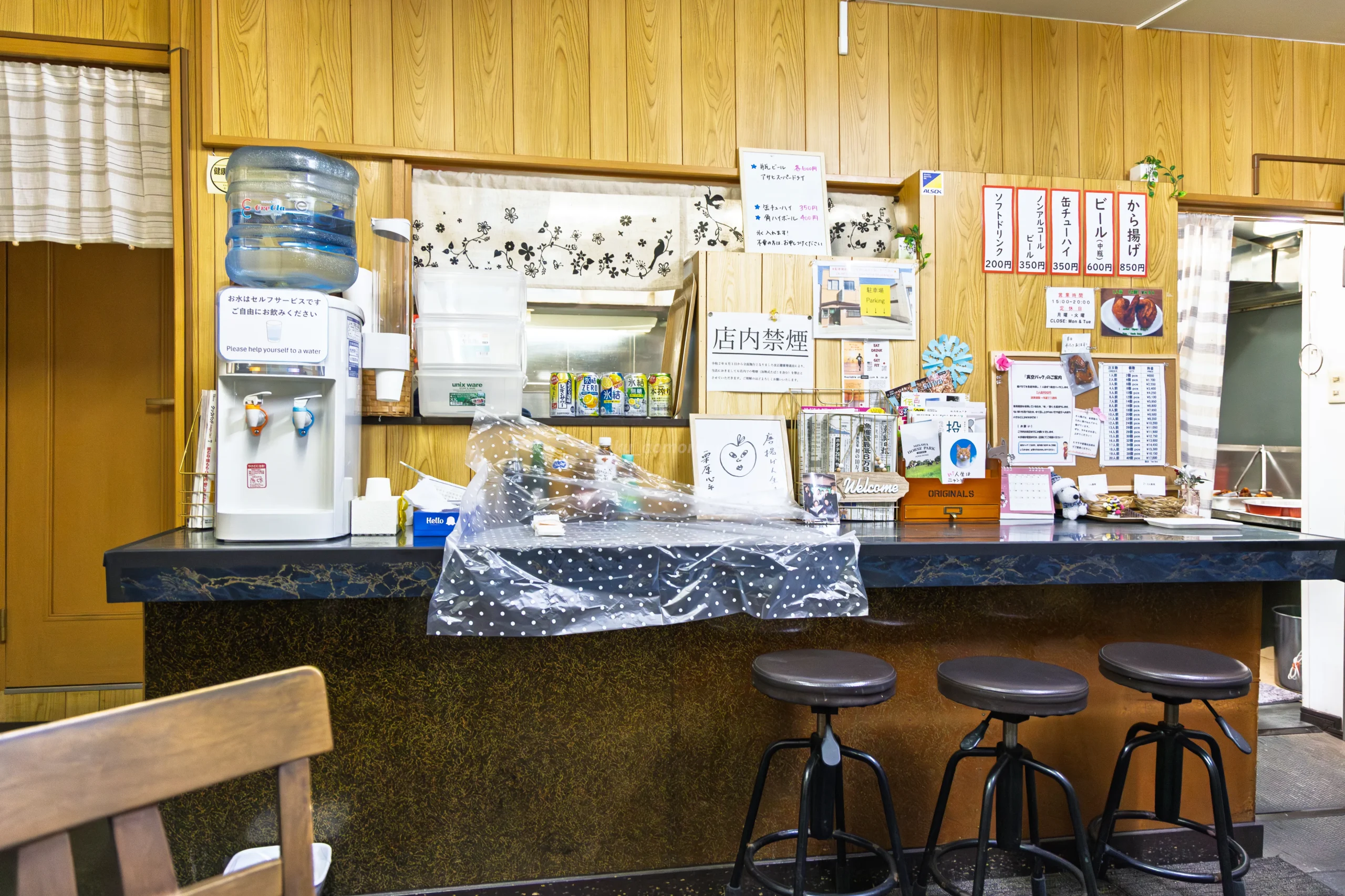 お店は三沢市の繁華街付近の三沢警察署から徒歩1分ほどの場所にあり、繁華街方面から立ち寄る方にもアクセスしやすく便利。テイクアウトの需要が非常に多いものの、店内にはカウンター席が3席分と、4名掛けのテーブル席が2卓あるため、イートインでおひとり様でも、家族や友人などとも使いやすいです。
