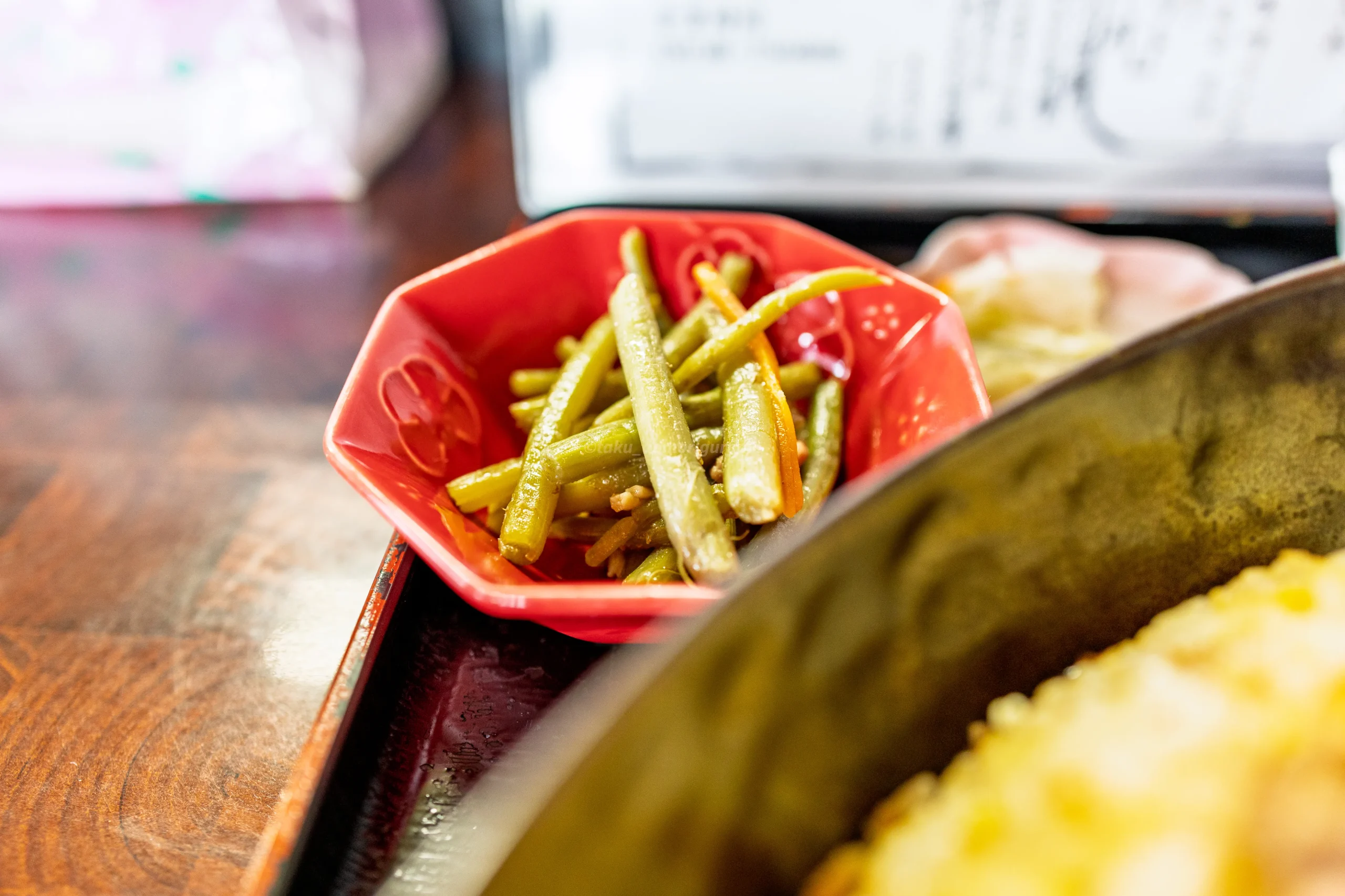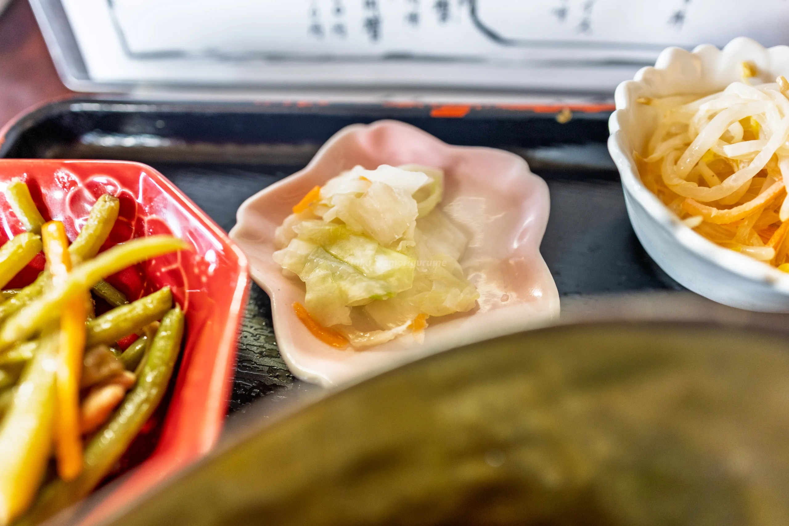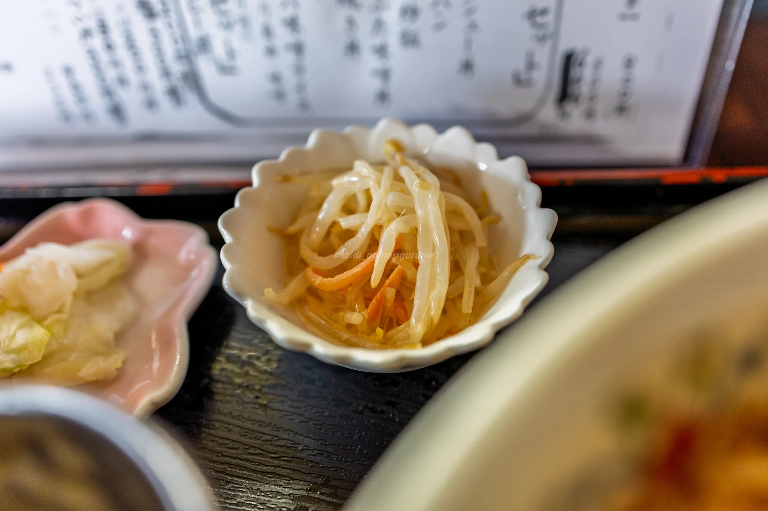 小鉢のもやしナムルはブラックペッパーが効いたスパイシーな味付け。