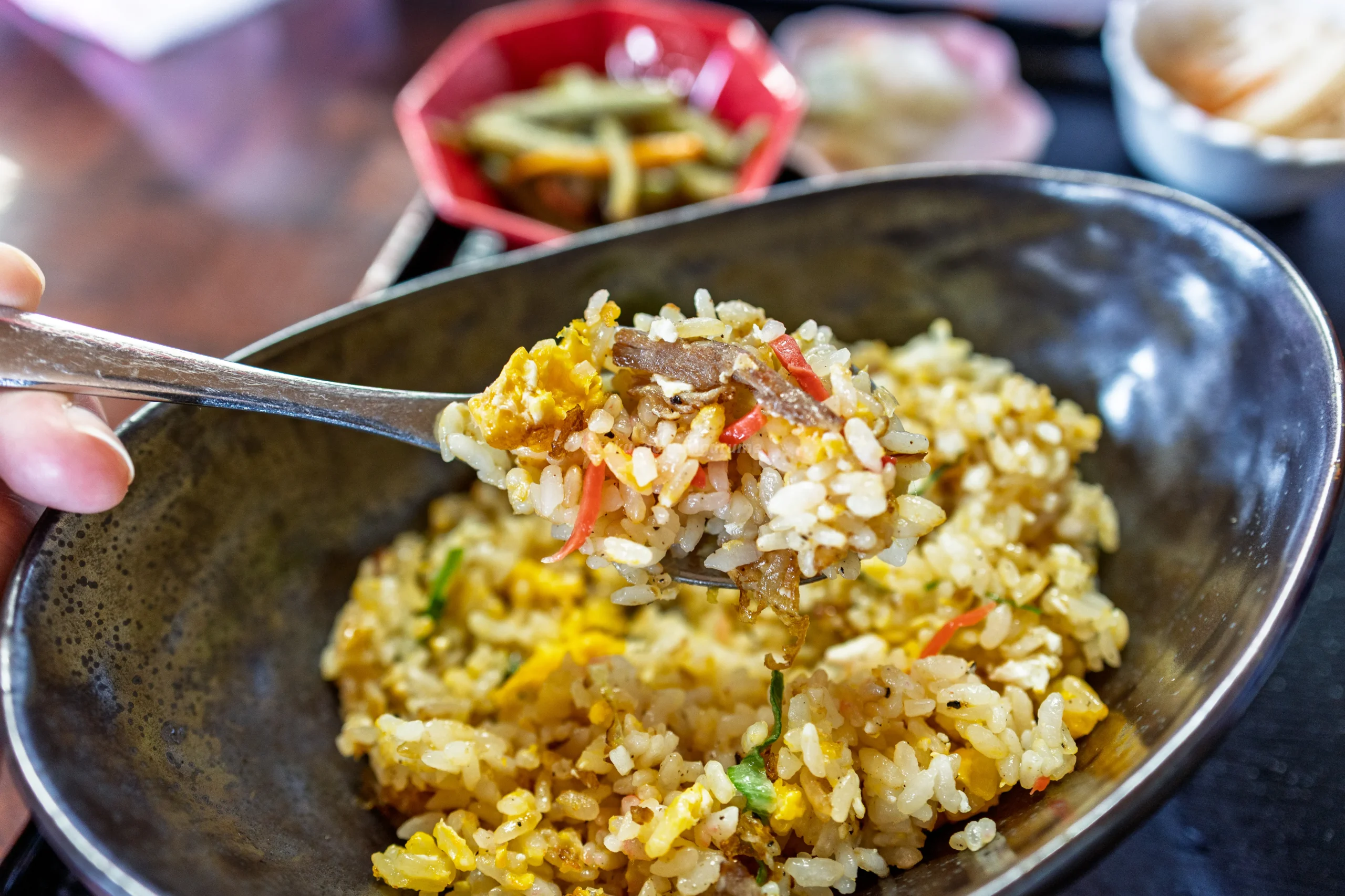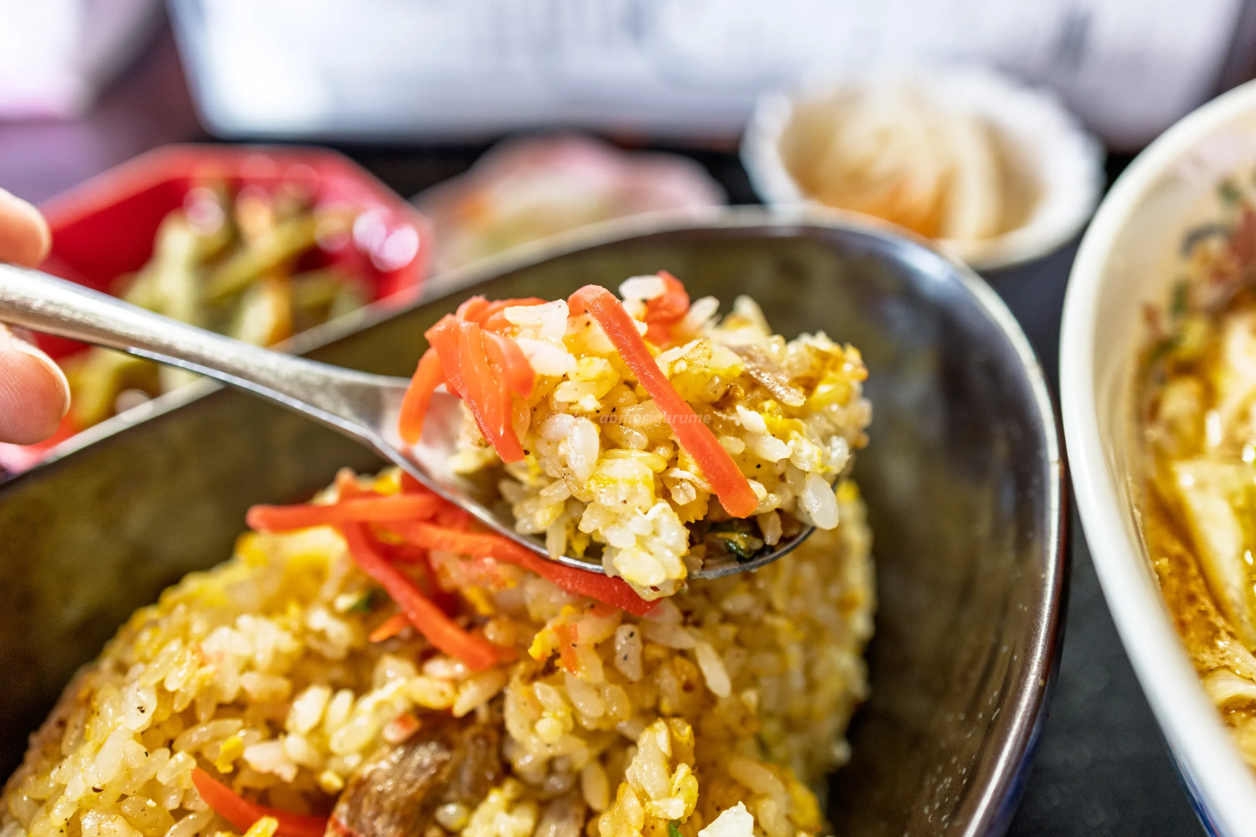 紅生姜入りのチャーハンで、細かく刻まれたチャーシューと、しっかり火の通った卵がたっぷり。