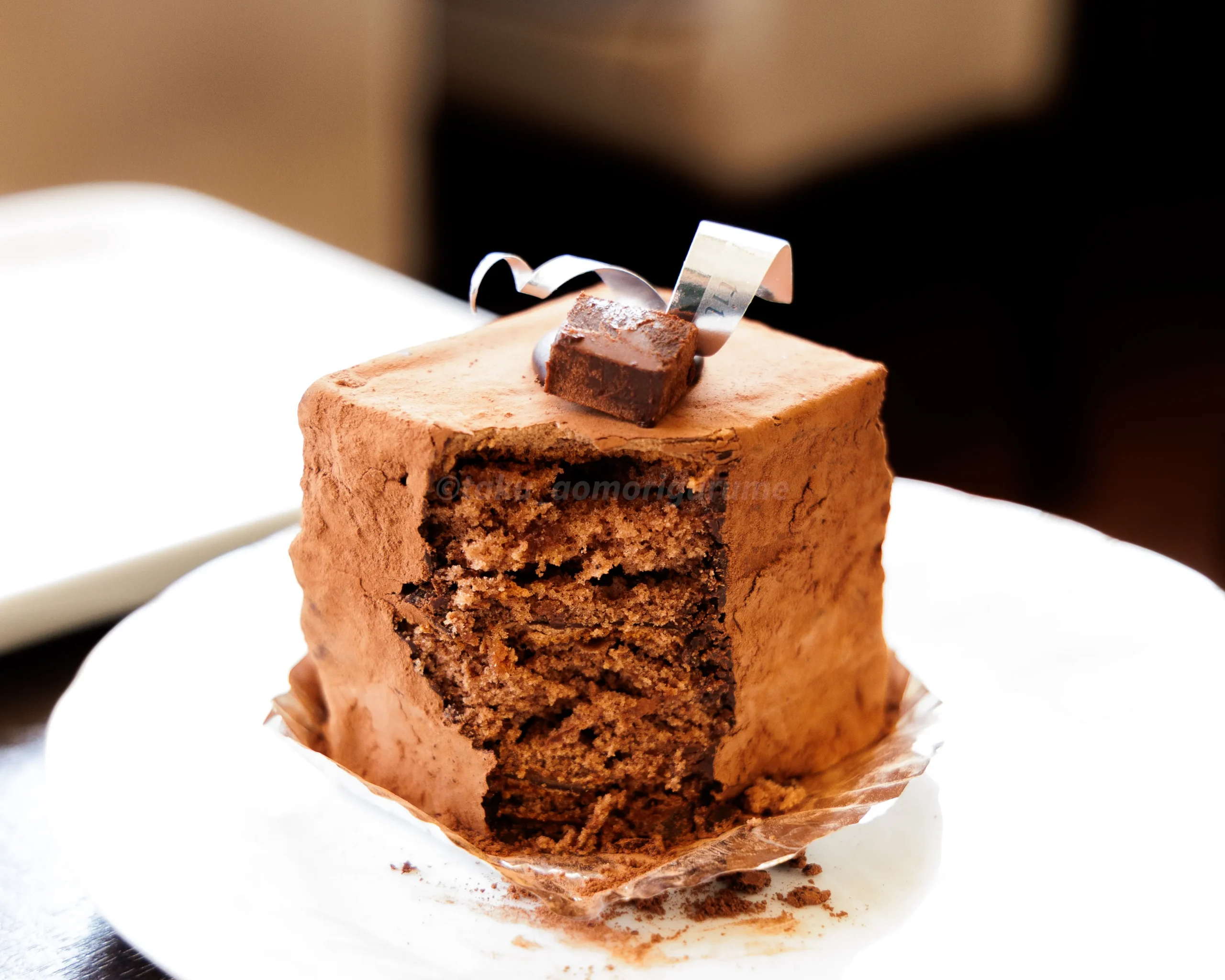 チョコスポンジ、チョコレートソース、木苺ジャムを用いて多層構造にしたものを、チョコレートでコーティング。