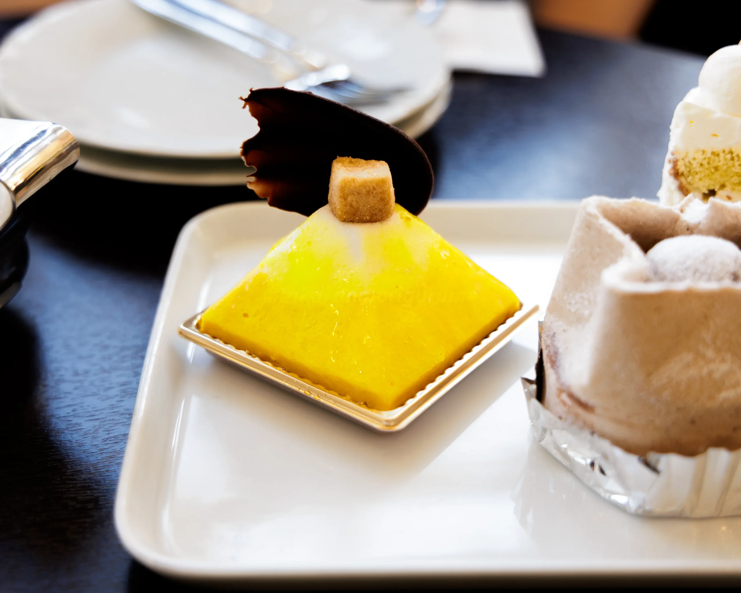 濃厚なマンゴーフロマージュとさっぱりしたココナッツムースのケーキ。