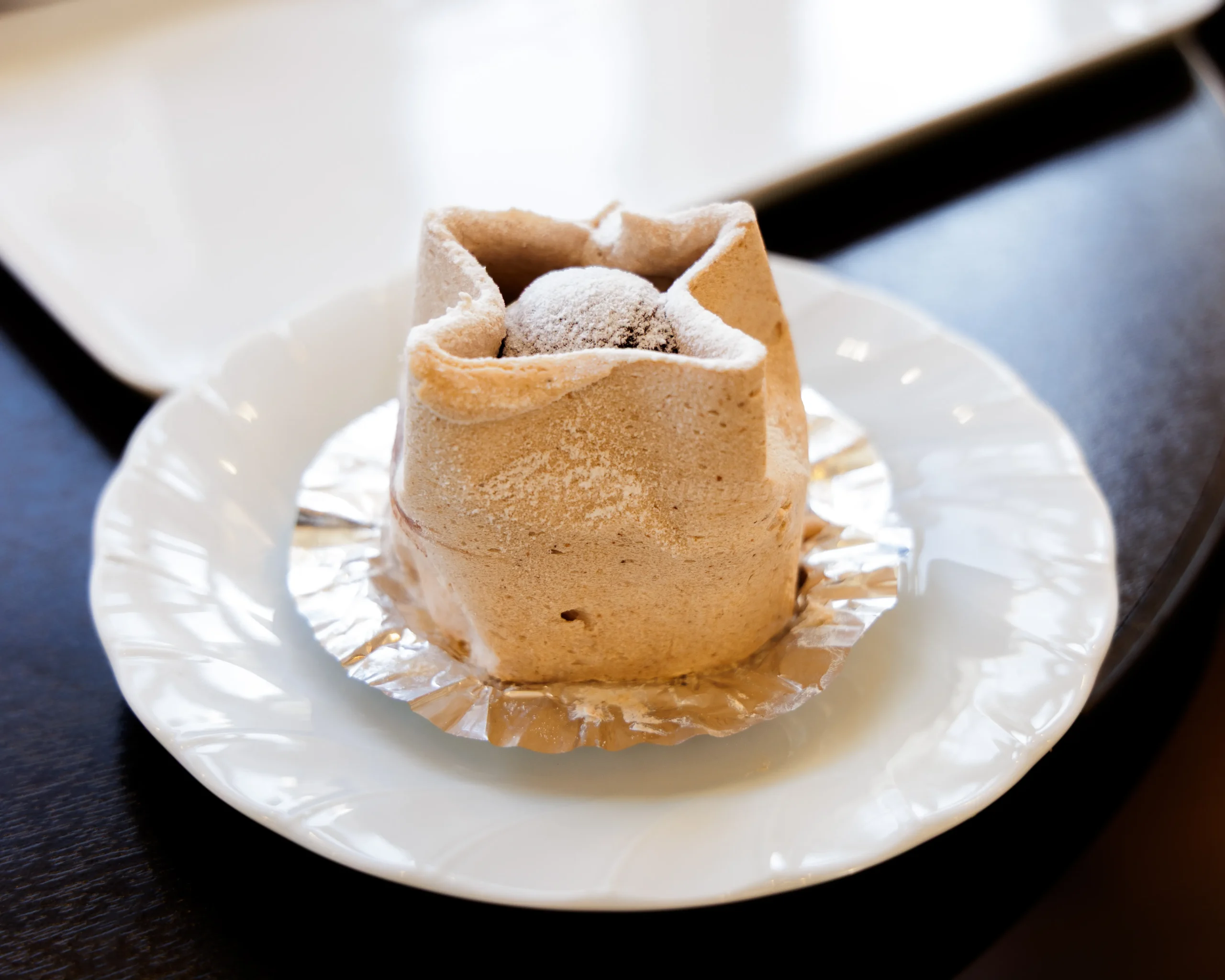 外側はチョコレートでコーティングされていて、トップにはアクセントとしての銀の飾りと生チョコが。