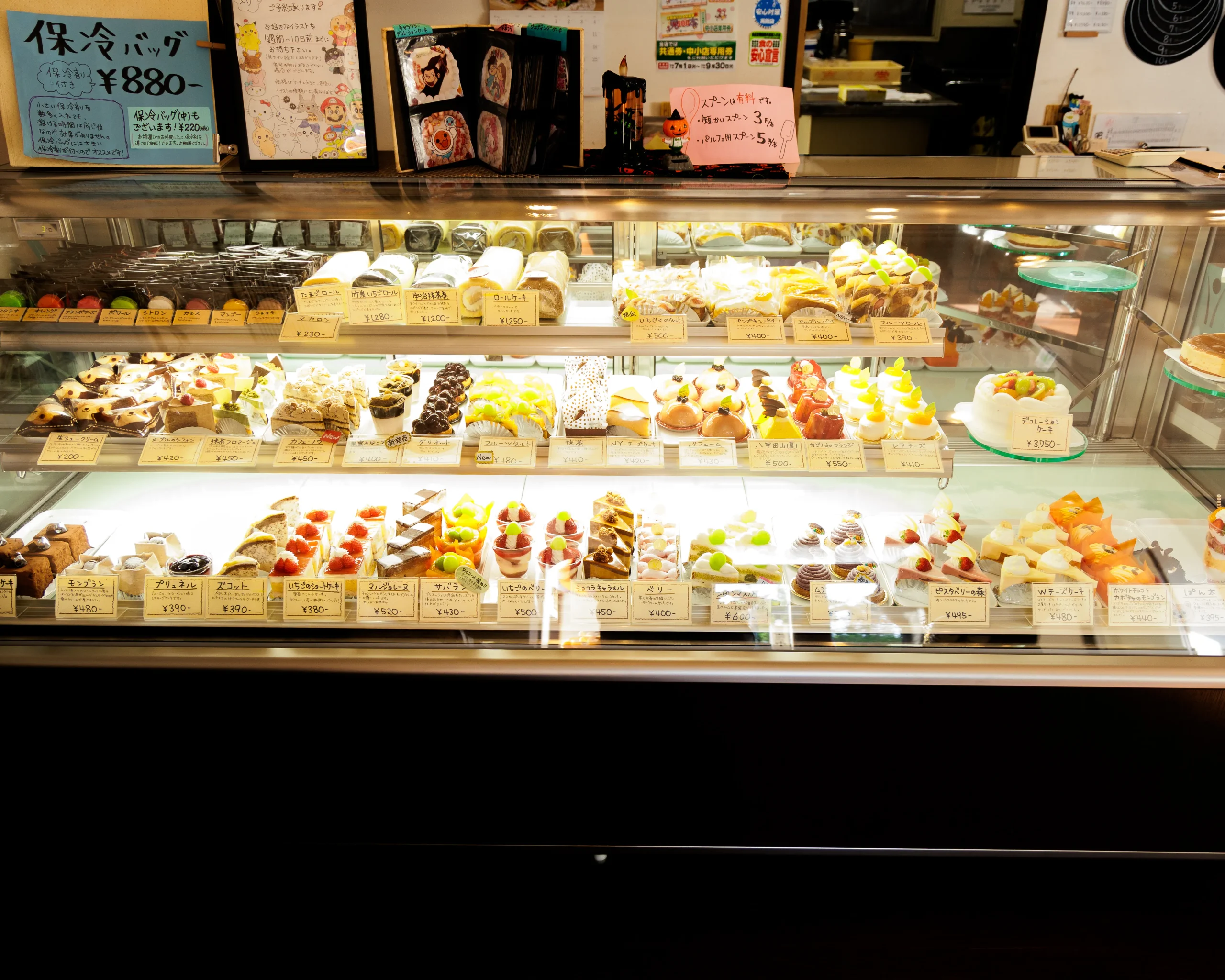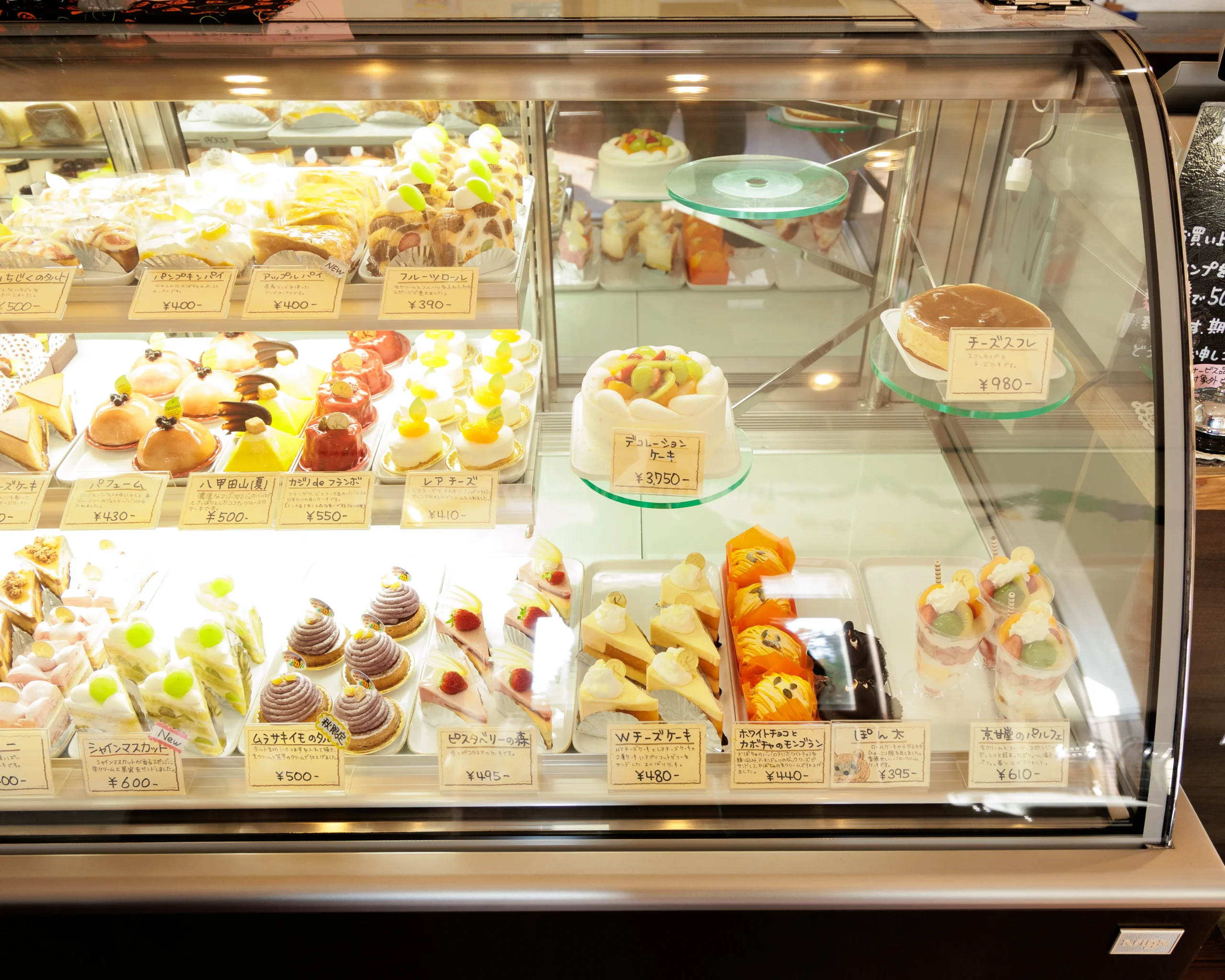 色とりどりの生洋菓子(ケーキなど)が陳列。
