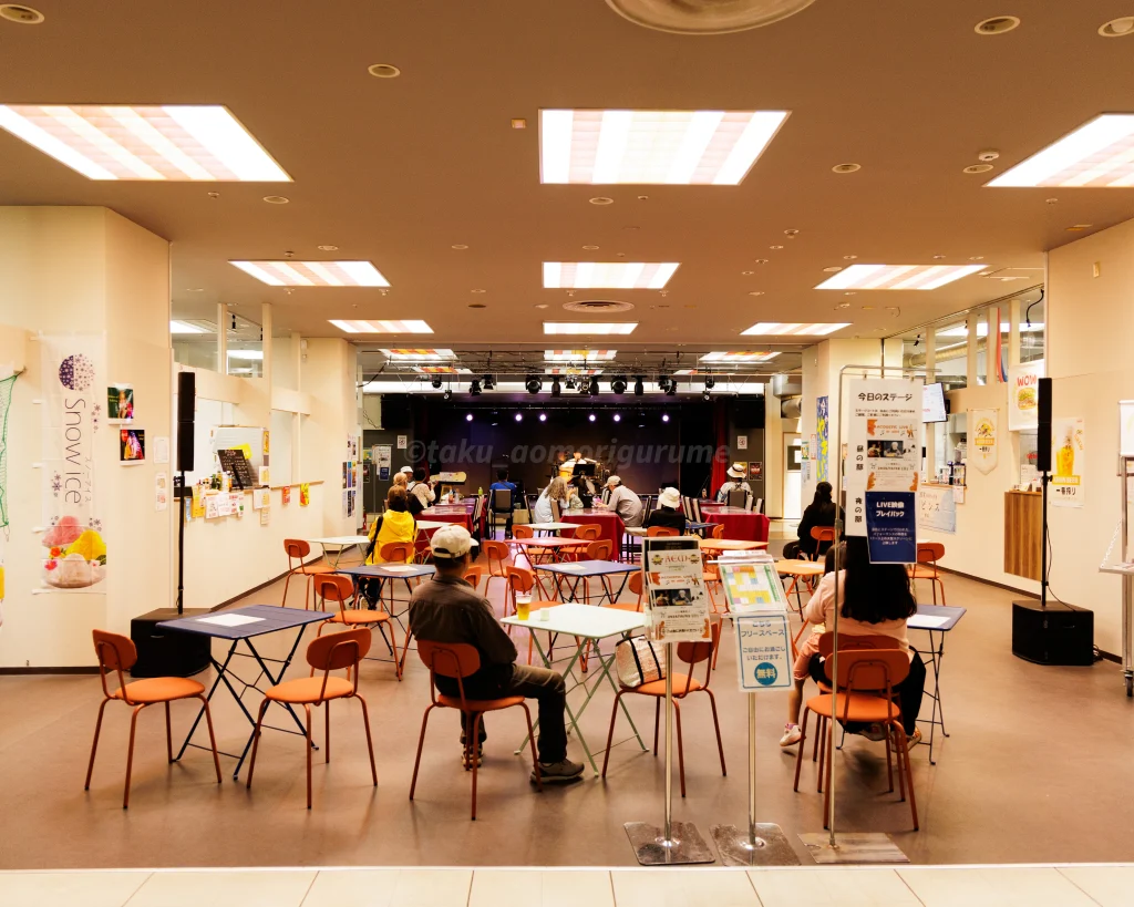 フリースペースが広がっており、周囲には飲食店と、さらに奥にはステージがあった。