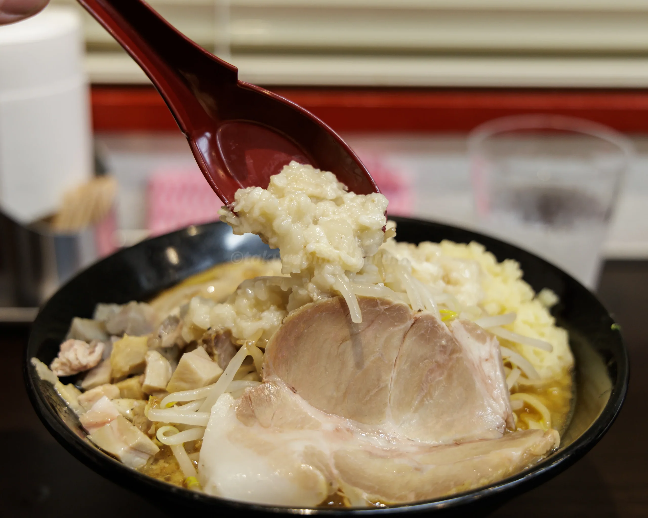 また、ニンニク、ヤサイ、アブラも食券のみだと少なめ、普通の中からしか選べないが、マシマシ食券があれば、3種それぞれマシマシが選べるようになる。詳細が気になる方は、以下の記載内容を参考にしてほしい。※有料のマシマシ券の部分は( )。