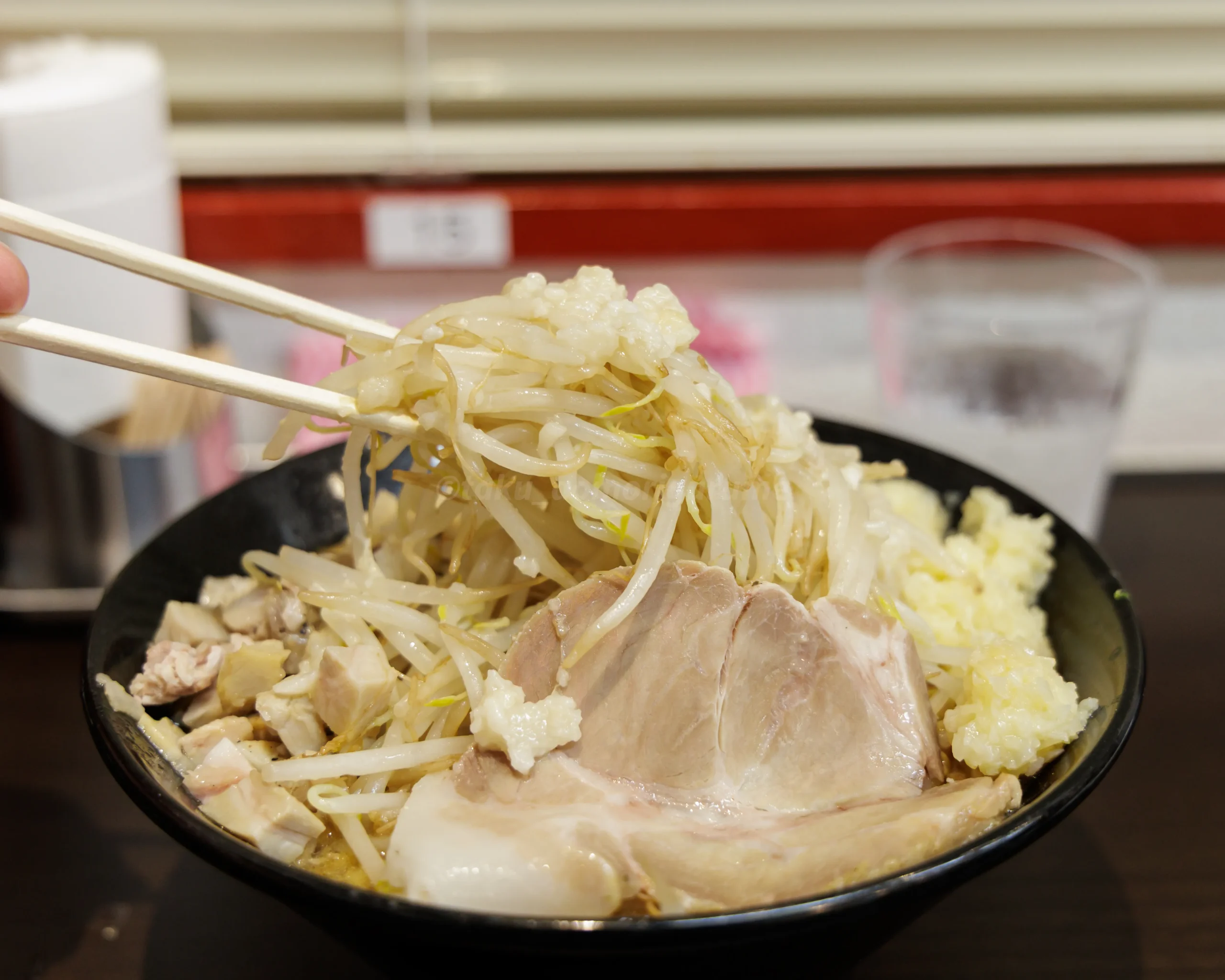 小麦の風味と旨味がダイレクトに味わえて、スープとニンニク、アブラ、ヤサイをも引き連れてリフトされるその姿に、本能で食らい付いた。