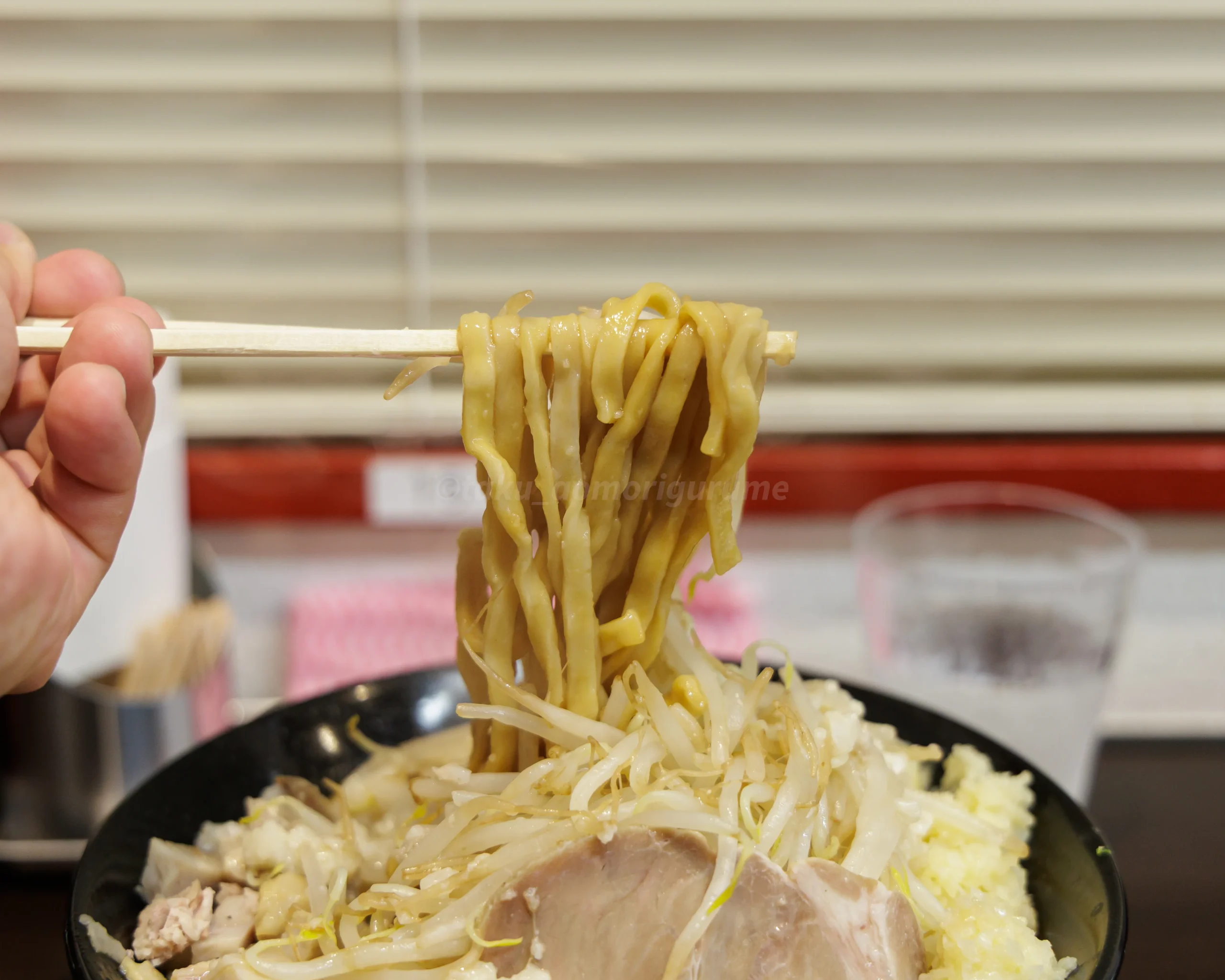 二郎系(二郎インスパイア系)でお馴染みの、ワシワシとした食感の極太平打ち麺。