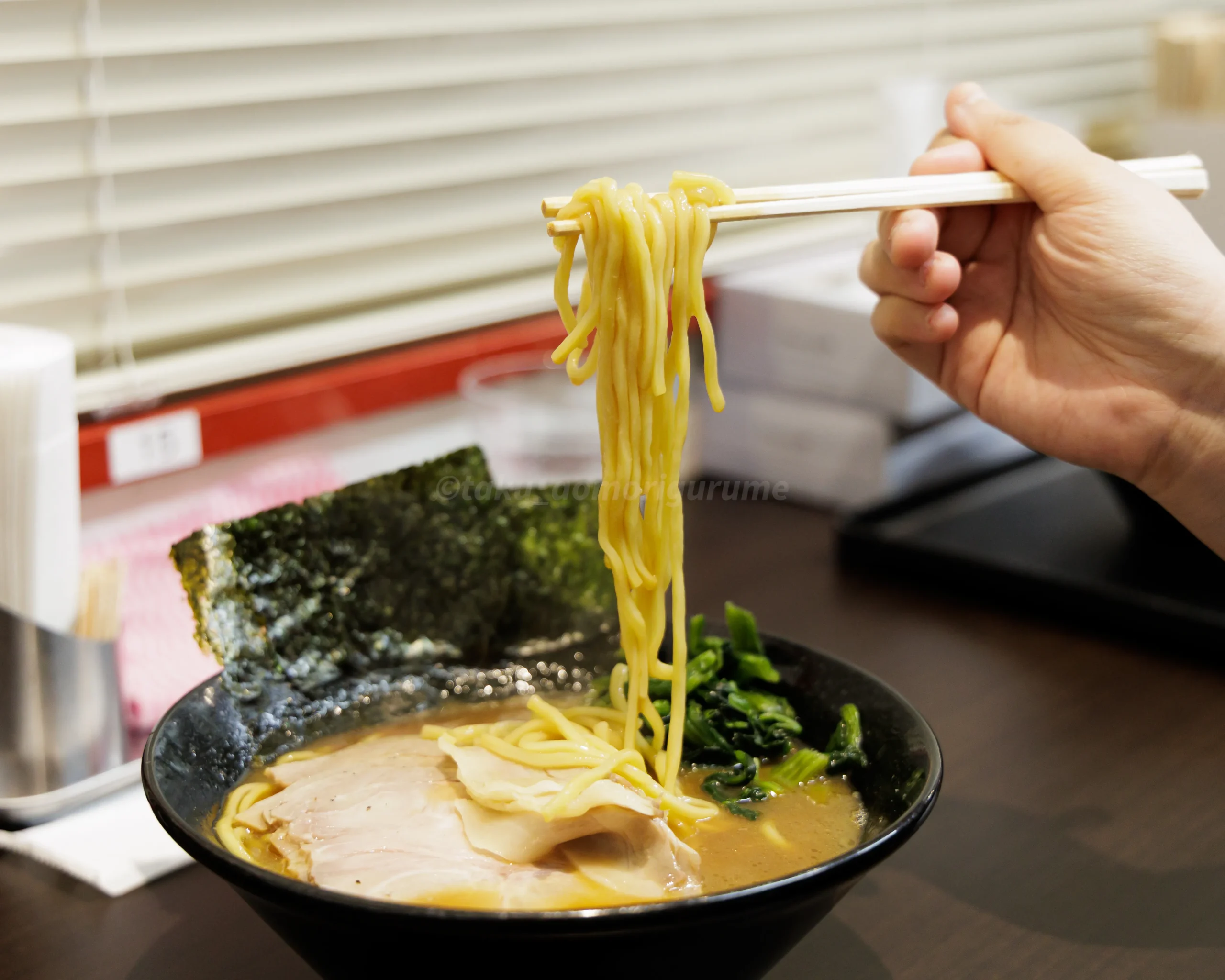 家系ラーメンの麺は、太く平たい、もちもちとした太くて平たい、もちもちとした食感のストレート麺が特徴。