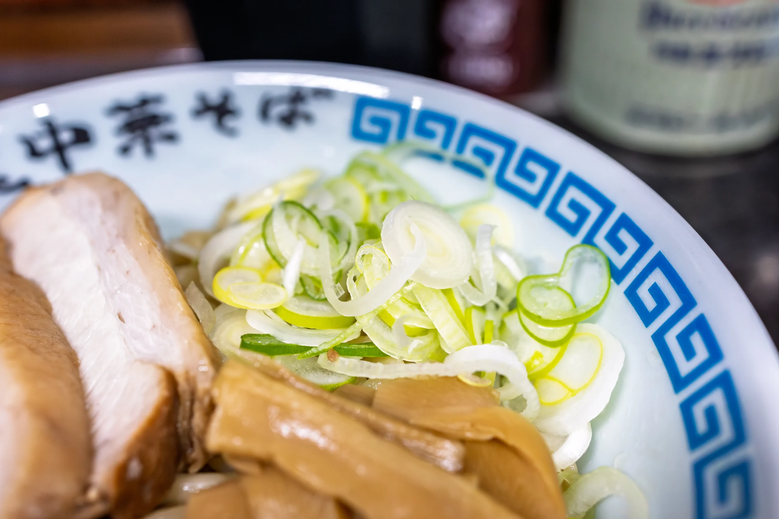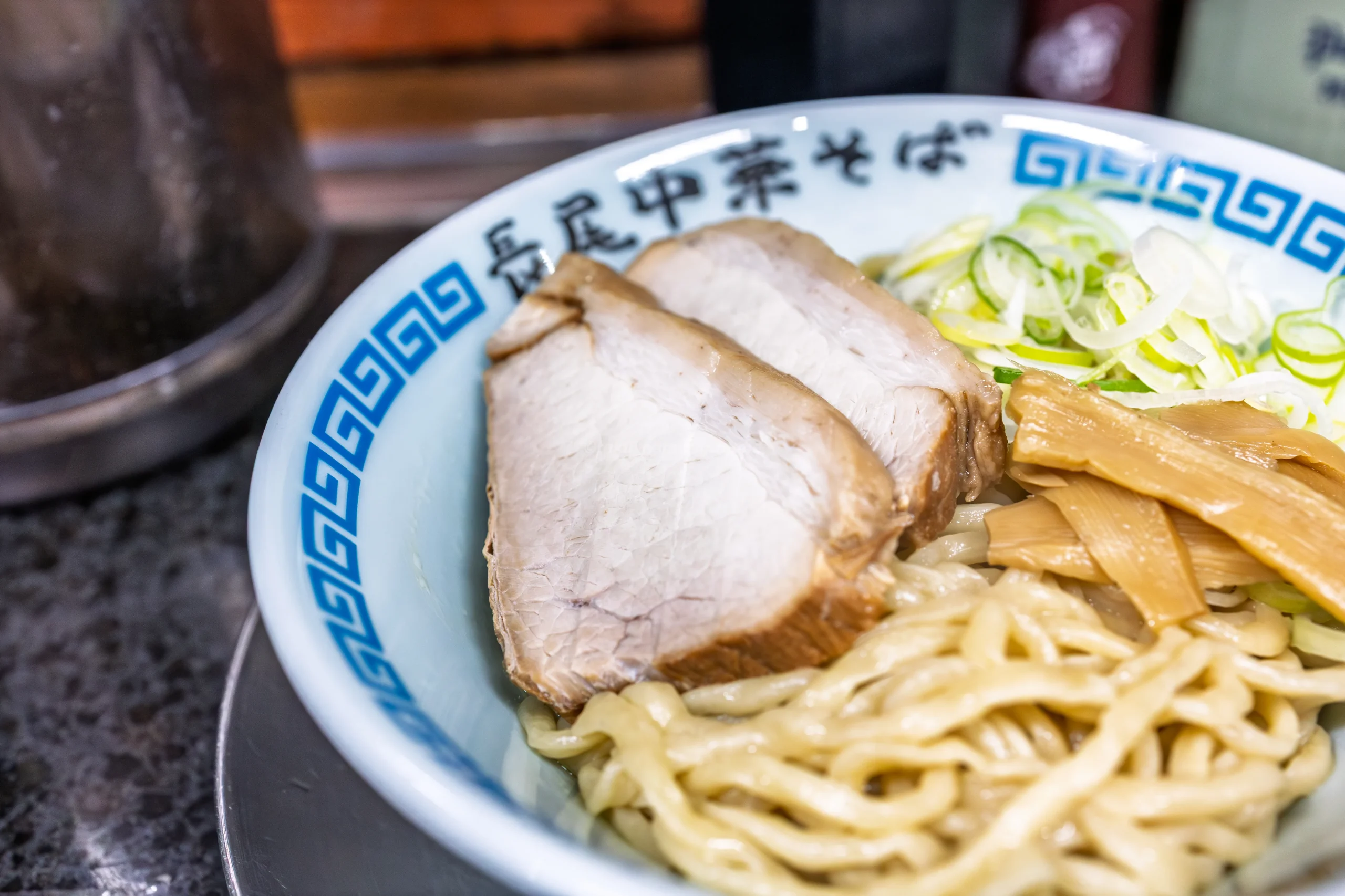トッピングはシンプルに、分厚いチャーシュー2枚・ねぎ・メンマの3種構成。