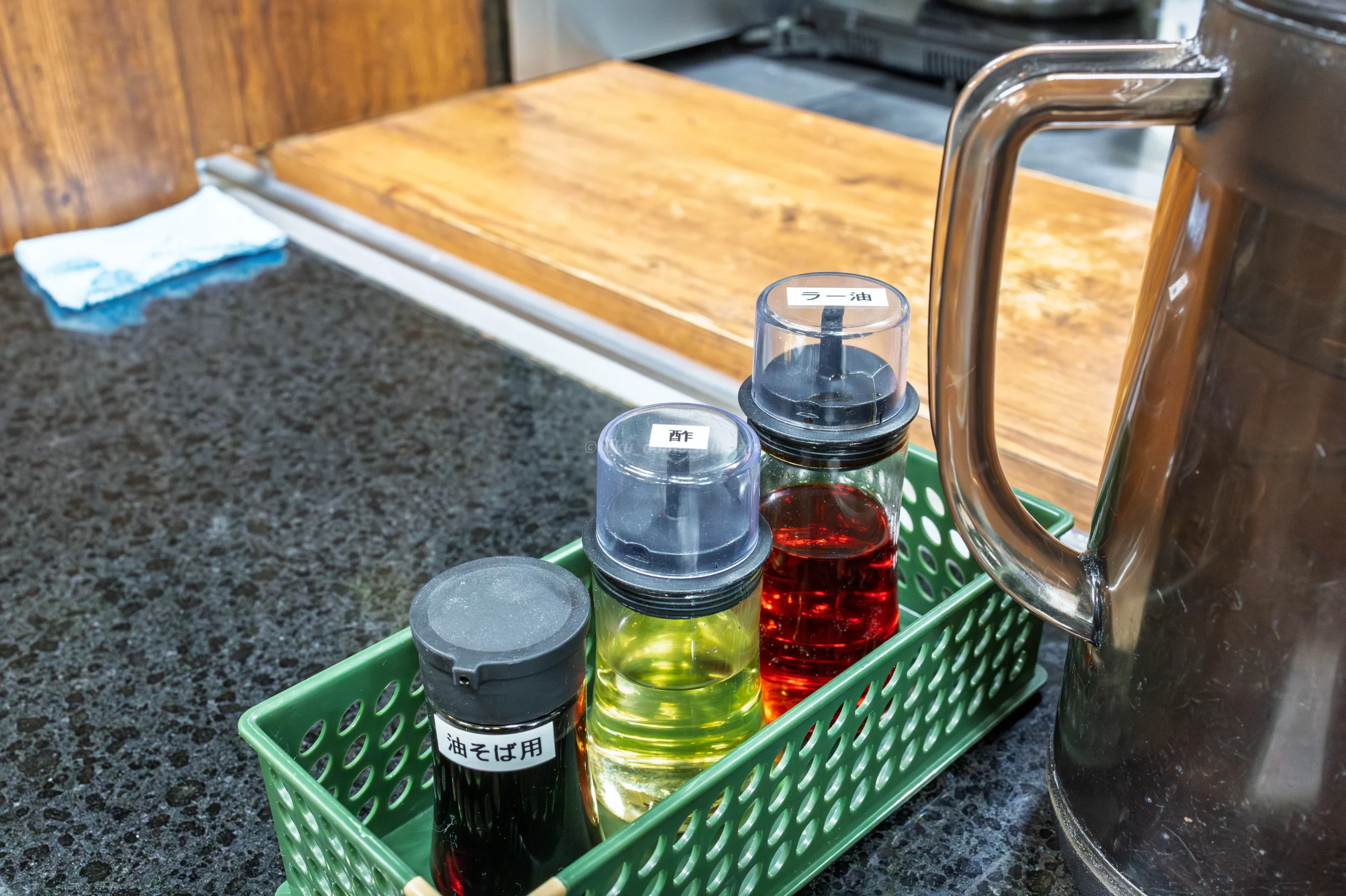 ベースのタレが濃いめのため、酢を加えると輪郭が引き締まり後半の食べ進みが軽くなる。ラー油は辛味と香味を加え、味の厚みを補強。追加タレは味の再調整用。