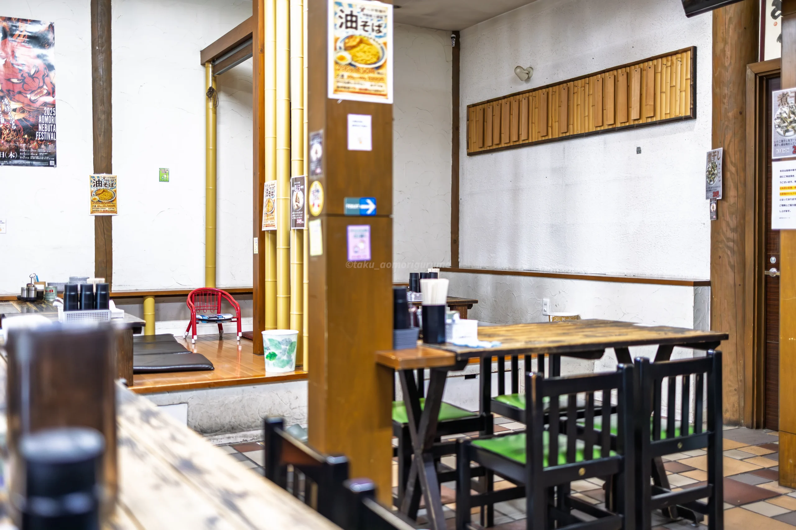 一人客から家族連れまで対応可能なレイアウトで、小上がりには子供用椅子もあり、ファミリー層の利用もしやすい印象。