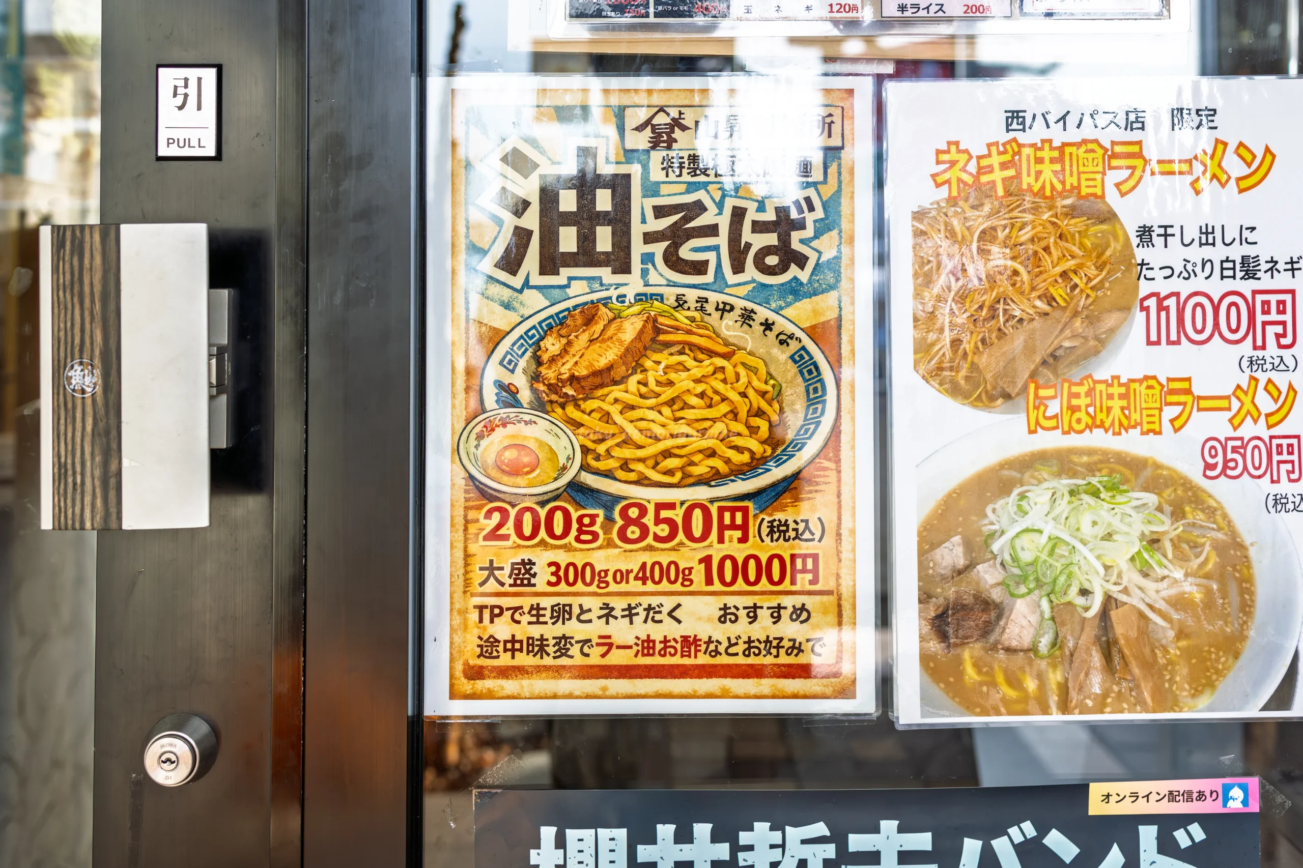 外観には限定メニューのポスターが掲示されており、2月21日スタートの油そばも入口付近で明確に訴求されている。入店前から商品認知ができる導線設計。