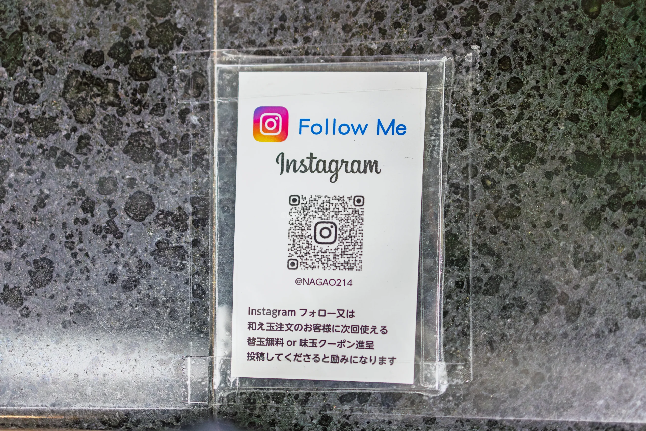 インスタグラムアカウントをフォロー又は和え玉注文された方は次回替玉無料or味玉クーポン進呈とのこと。