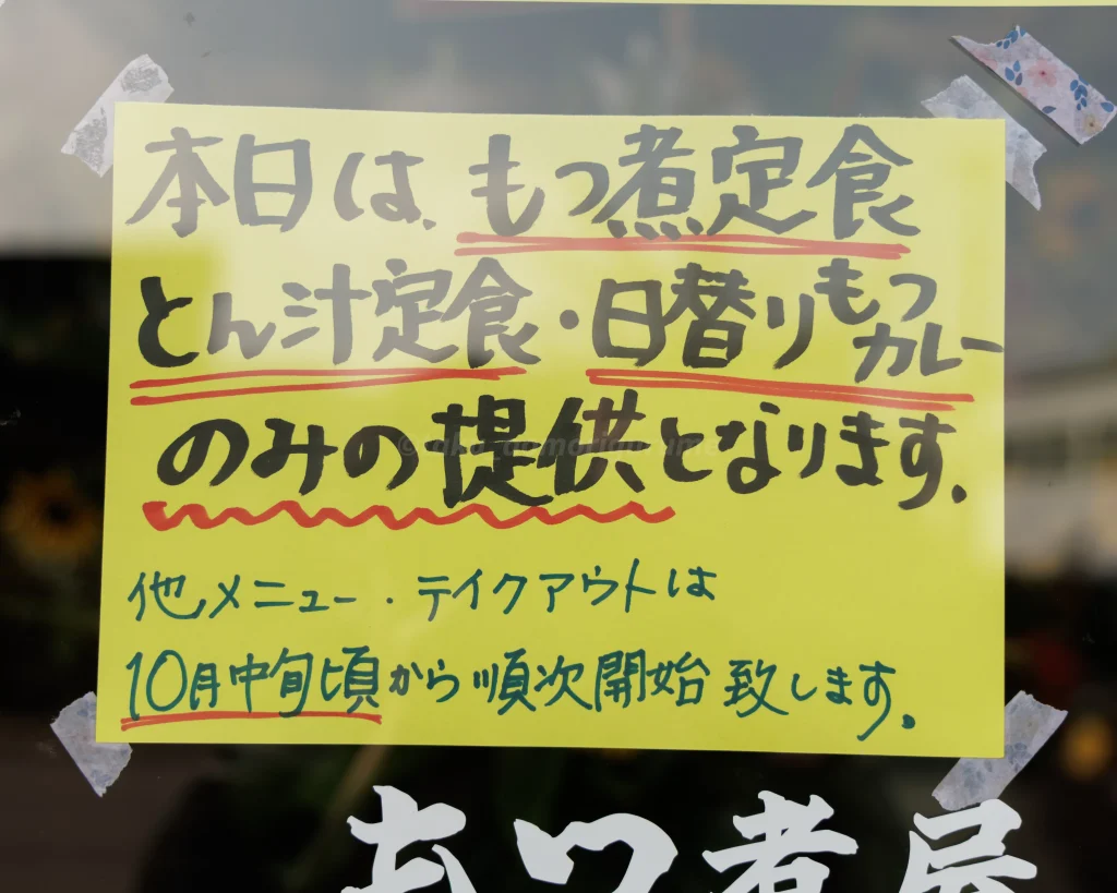 訪問日は10月初旬であったので、店内飲食メニューのみの提供かつ、メニューはもつ煮定食、日替わり定食、とん汁定食のみであった。
