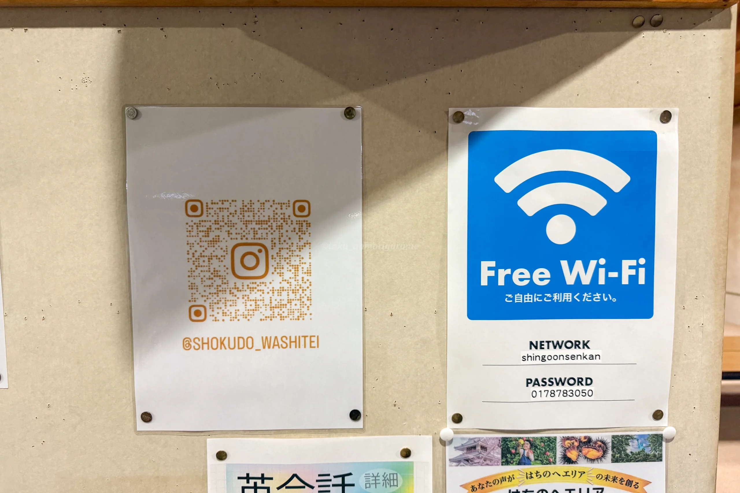 食道 わし亭のInstagramのQRコードが貼られている隣に、信号温泉館内の無料Wi-Fiの案内が掲示されていた。