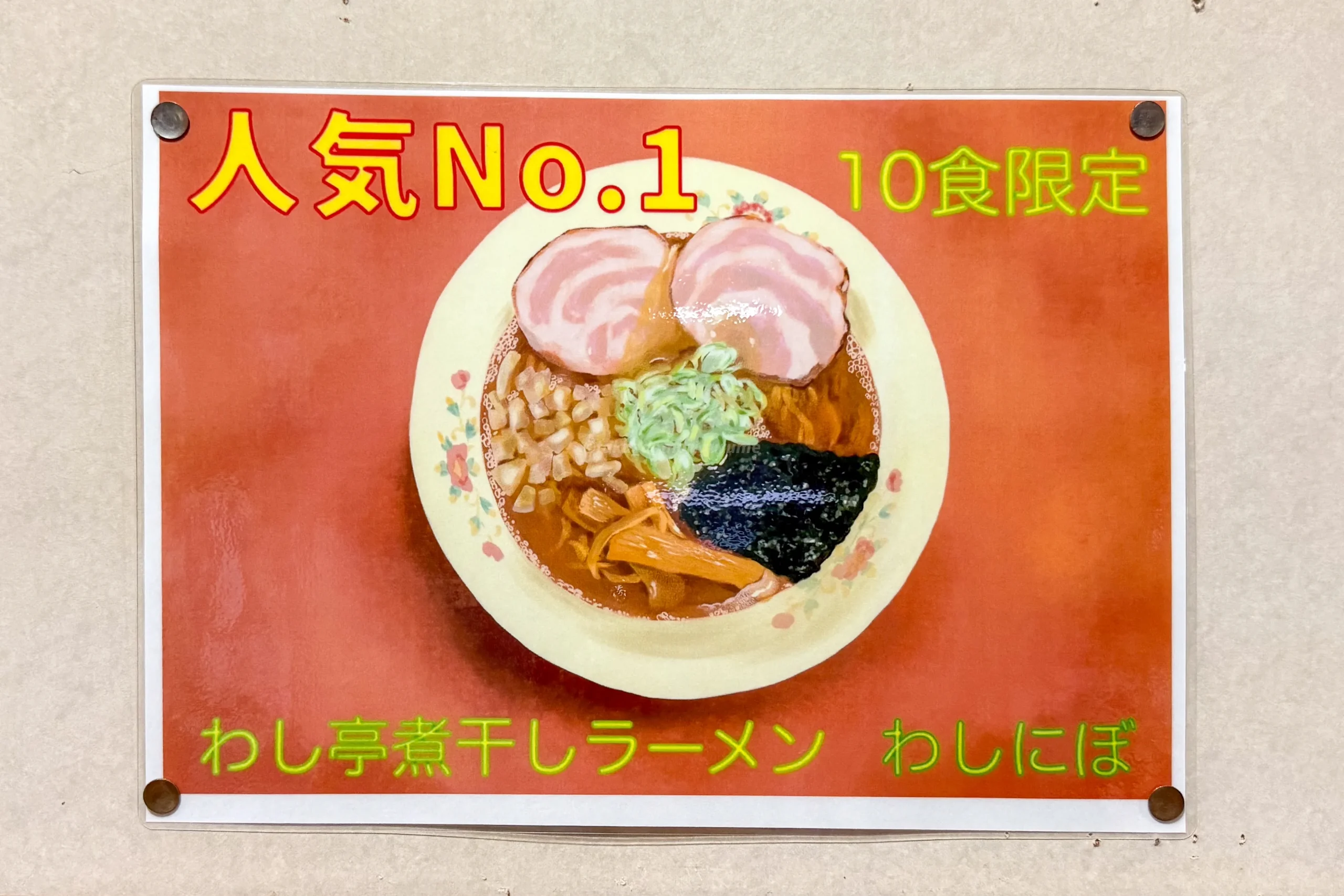 スープは、名前の通りわしにぼに比べて煮干し成分がハッキリと濃く、よりビターに感じられた。