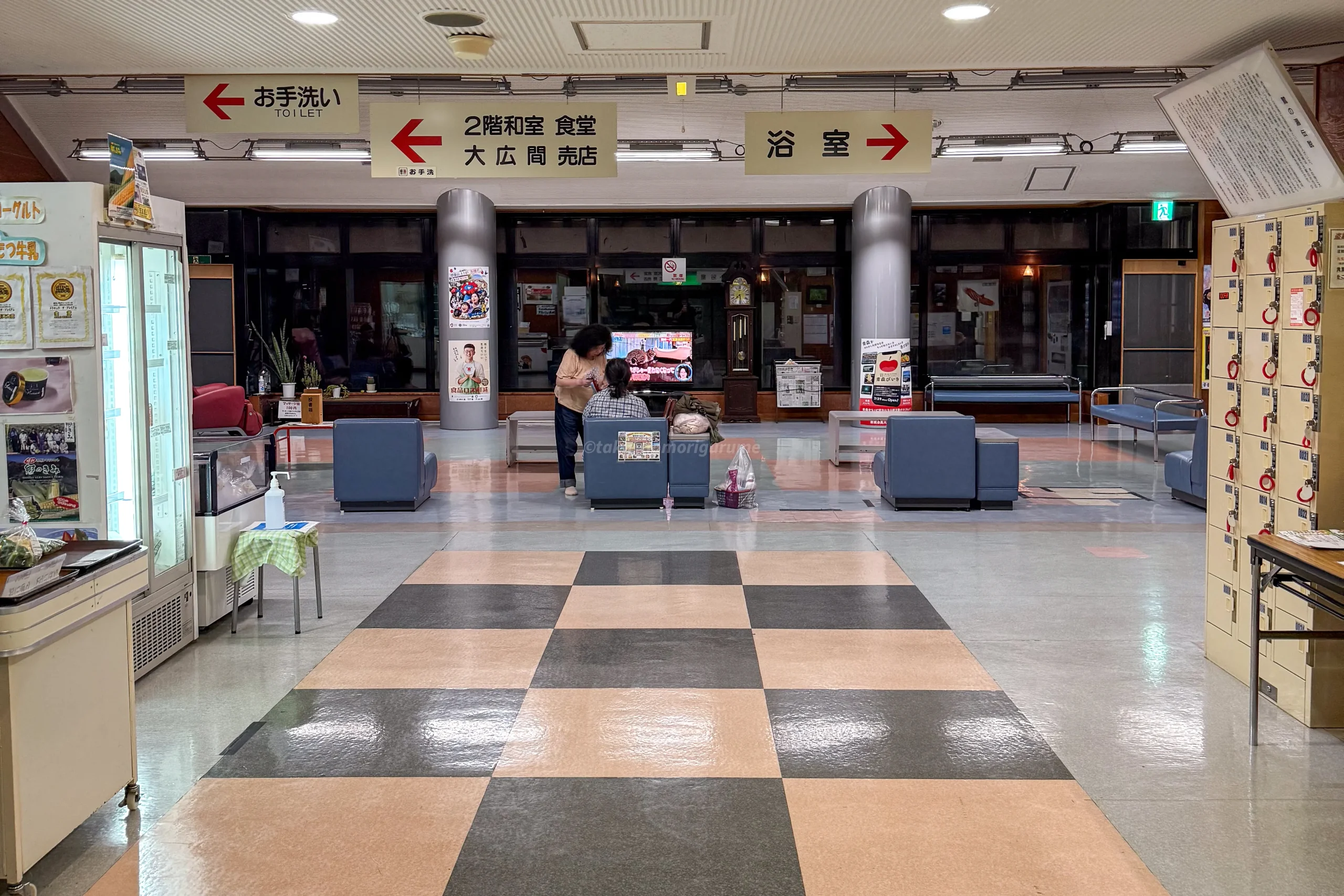 また、画像の上の部分の案内看板にもあるように、突き当たり右手が浴室、左手が2階の和室(全8室の和室で、宿泊または日中の休憩利用が可能)、1階にある食堂、1階の畳の大広間(日帰り入浴客や食堂利用客向けの無料休憩スペースとして解放中)がある。