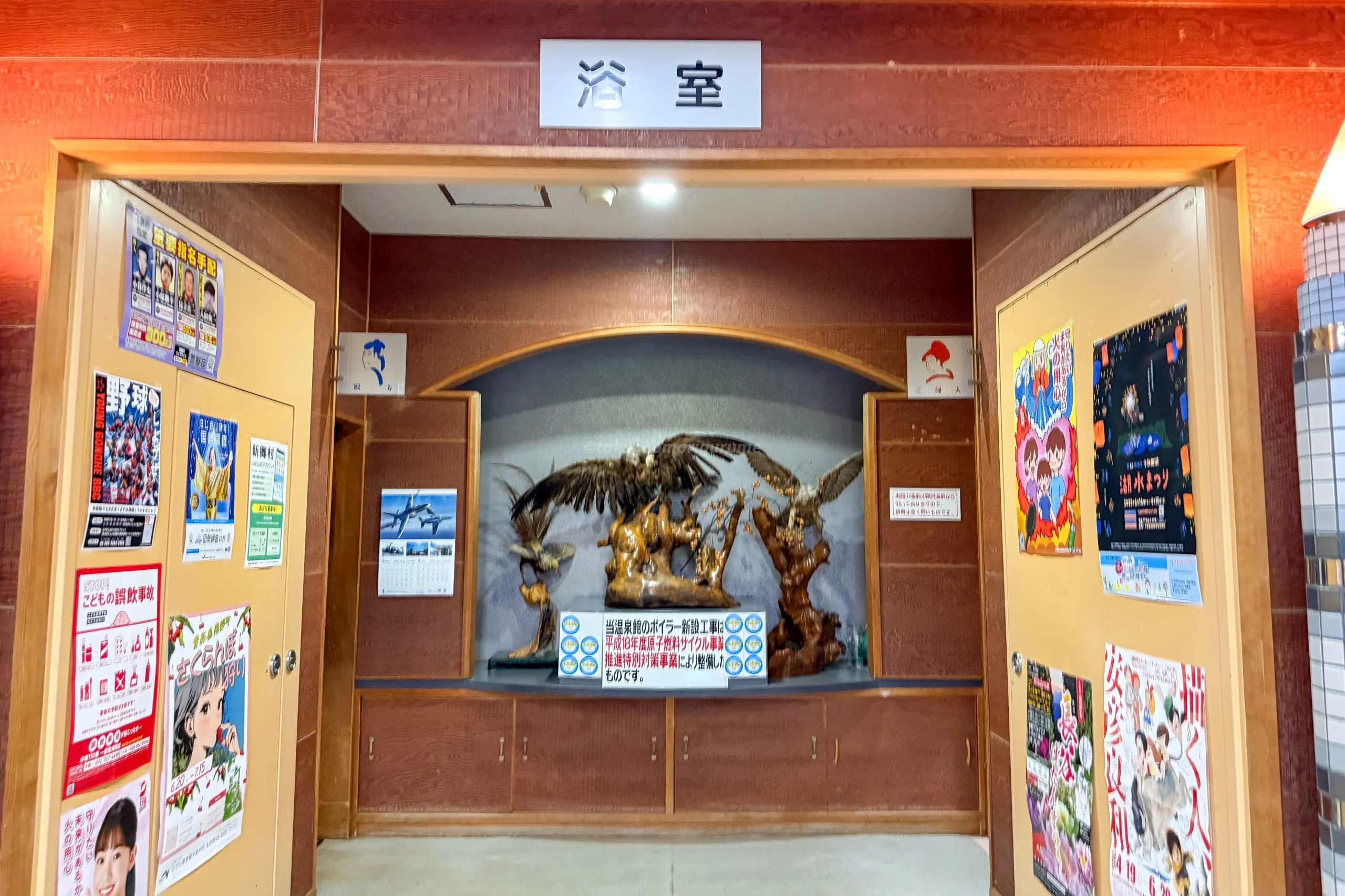左手にある木のオブジェは大鷲がモチーフとなっていて、この地に伝わる鷲の湯伝説(大鷲がこの地で湧く温泉で傷を癒した伝説)に因んだものとなっている。また、館内の浴室入り口にも、鷲の剥製が展示されている。