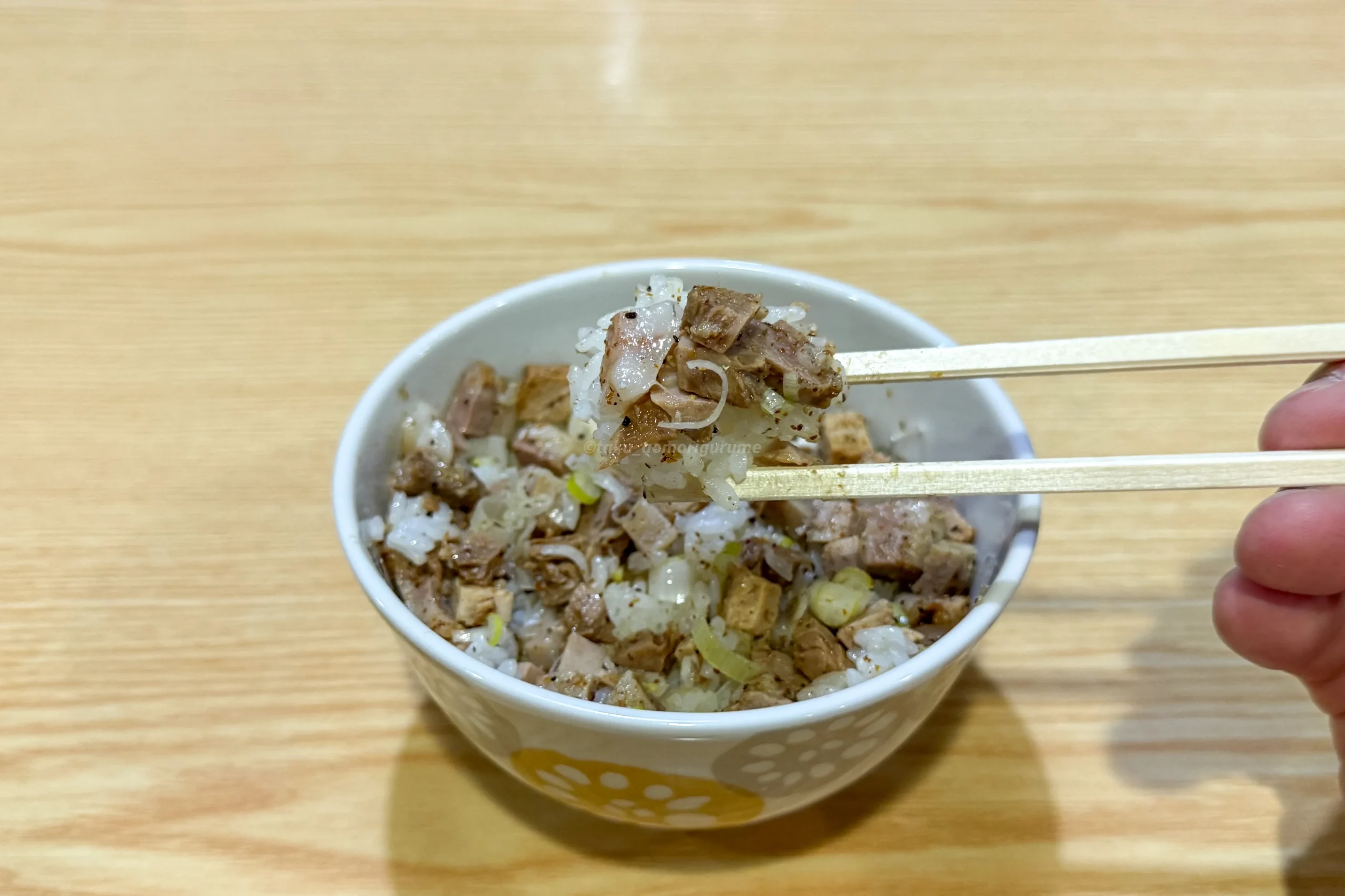 一般的なご飯茶碗に、細かく刻まれたネギとチャーシューがご飯を埋め尽くすほど載っていた。